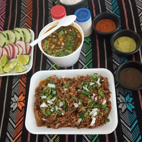Porción generosa de birria; ideal para compartir en reuniones, va acompañada de un vaso de consomé (6 oz).
