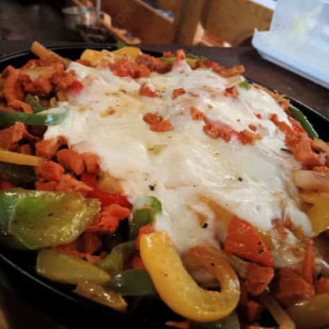 Morrón verde, amarillo y rojo con cebolla, sazonados en plancha y bañados de queso oaxaca más la carne de birria, la orden va con 10 tortillas.