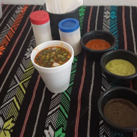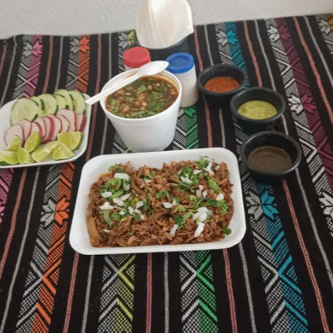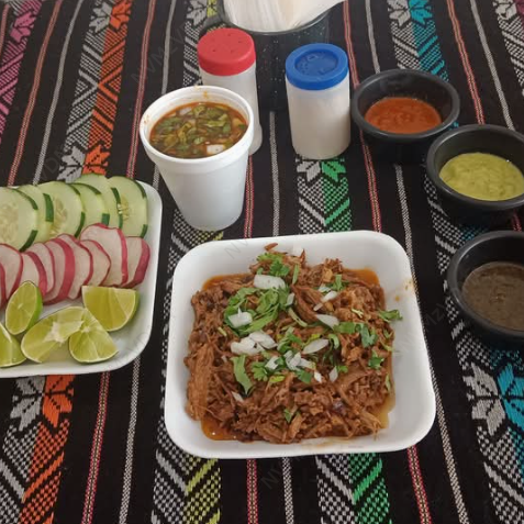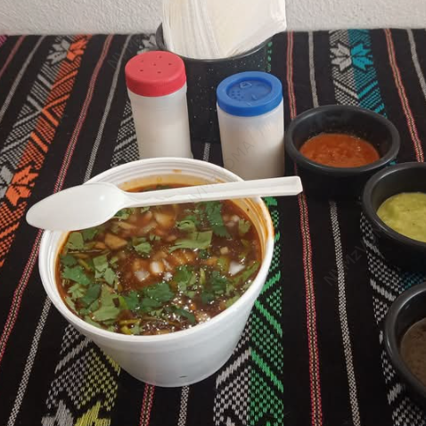 Medio litro de consomé con una porción de birria, ¡¡preparando con cebolla, cilantro, sal y limón!!.