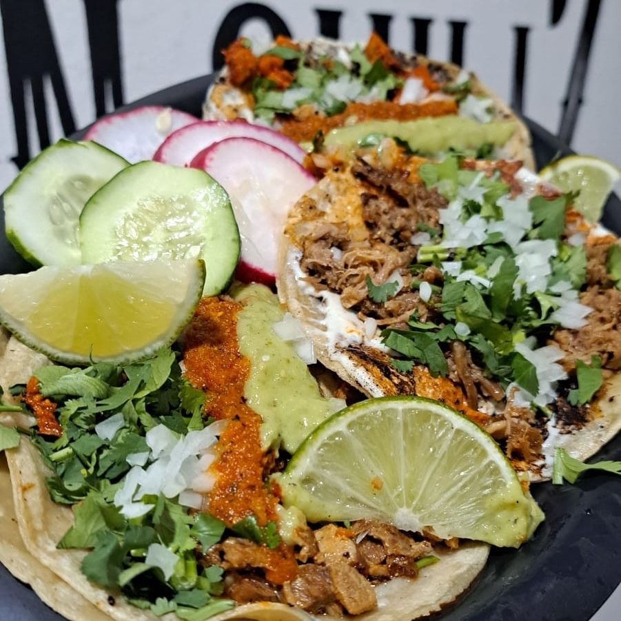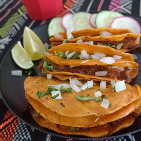Tortillas sazonadas en plancha con birria, cebolla, cilantro.