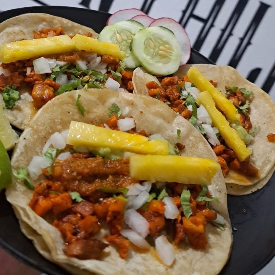 Taco al pastor, Carne al pastor bien marinada, dorada al fuego hasta quedar jugosa y llena de sabor, cortada directo del trompo como manda la tradición chilanga. Servido en doble tortilla calientita, con ese equilibrio perfecto entre especias, achiote y el doradito exacto que prende el antojo desde el primer aroma.