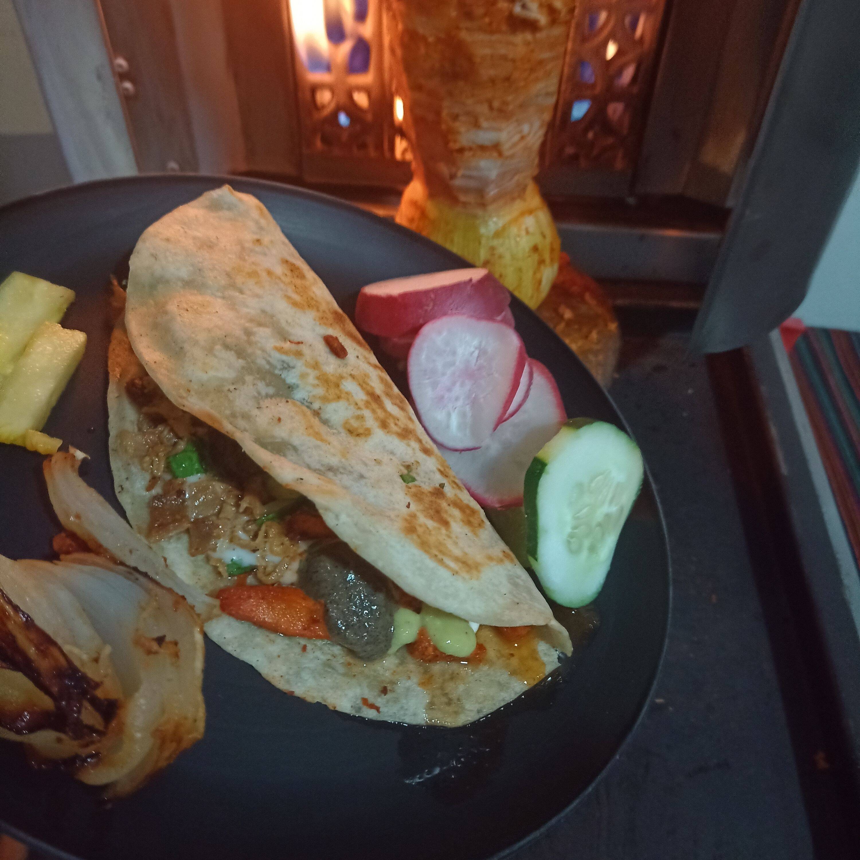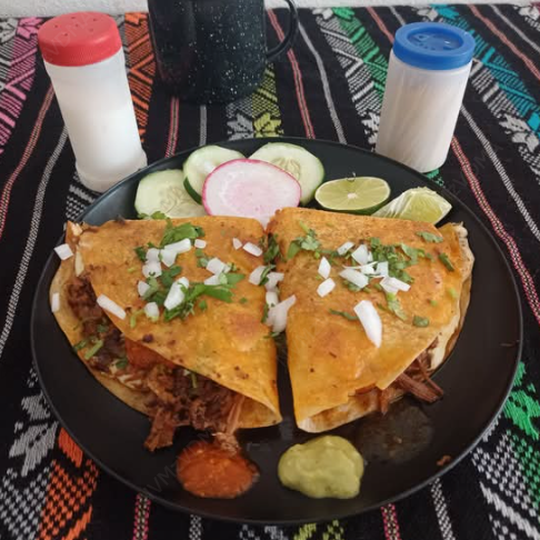Quesadilla de Harina de 25cm acompañada de una porción generosa de carne y queso Oaxaca
