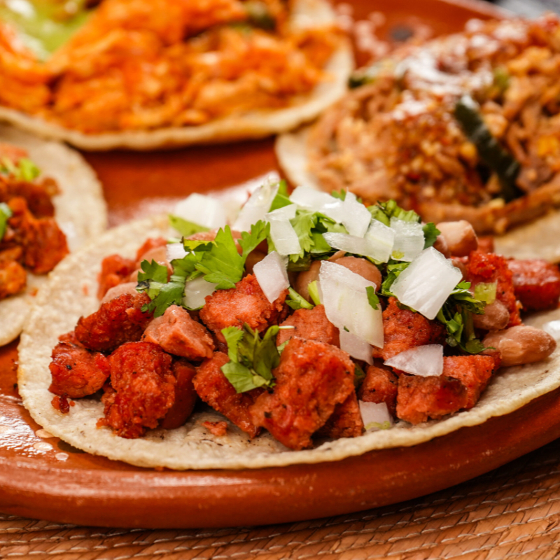Tortilla de maíz recién hecha con chorizo doradito y jugoso, acompañado de cebolla y cilantro. Un clásico lleno de sabor y tradición.