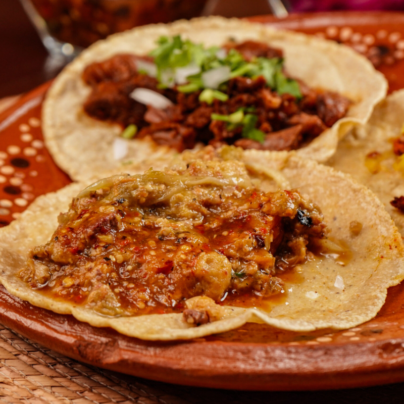 Tortilla de maíz recién hecha rellena de tinga de pollo deshebrado, cocinada en salsa de jitomate con un toque de chipotle, y acompañada de cebolla y cilantro. Sabor casero y reconfortante.