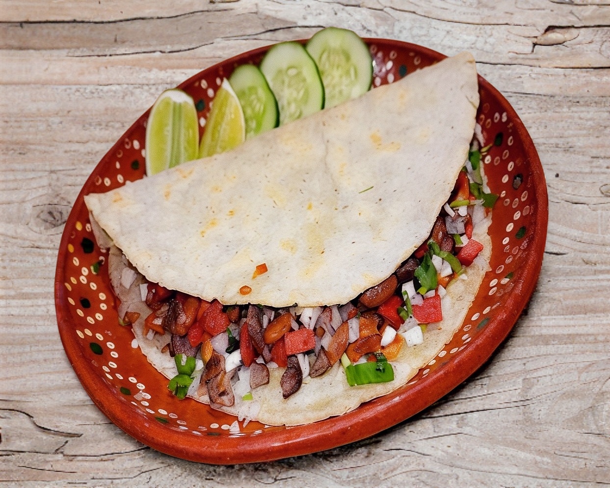Quesadilla con tortilla hecha a mano de tamaño aproximado de 30 cm, de carnes lleva asada, adobada y chorizo con queso manchego, frijoles de la olla, cebolla, cilantro y col