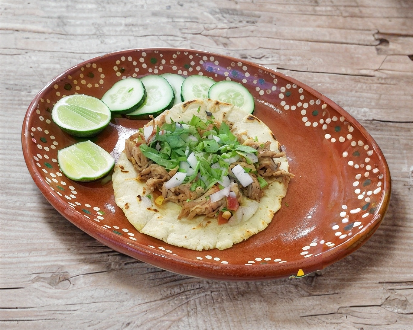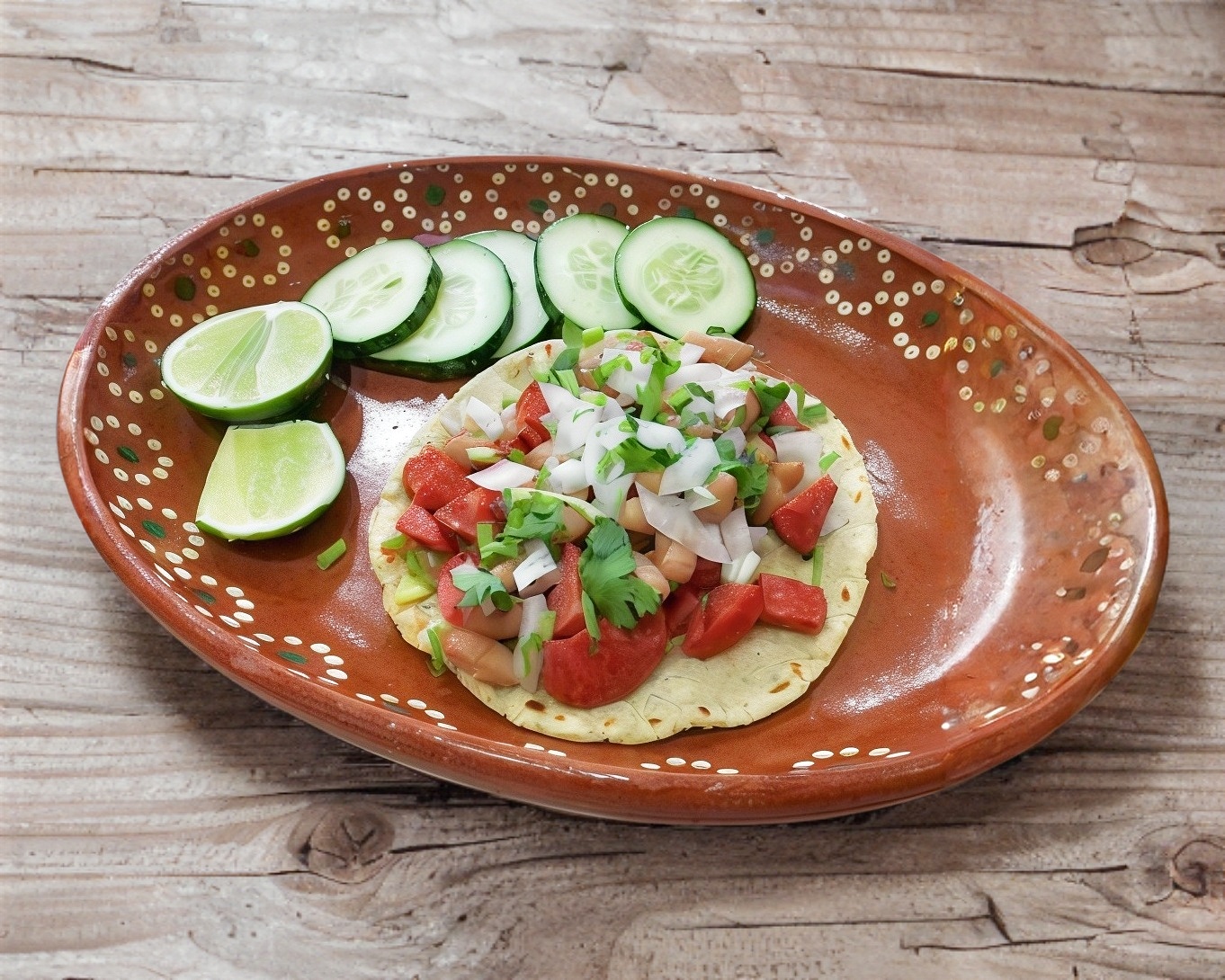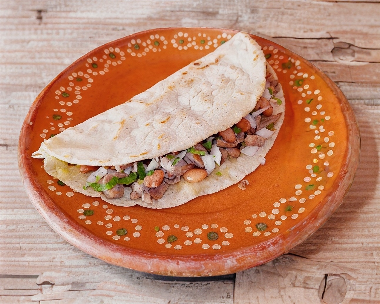 Tortilla hecha a mano;con cebolla, cilantro, frijoles y col.
