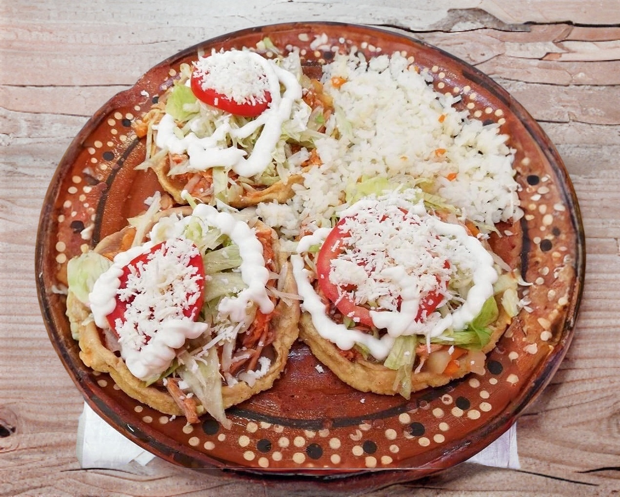 3 sopes de pollo, acompañados con arroz.