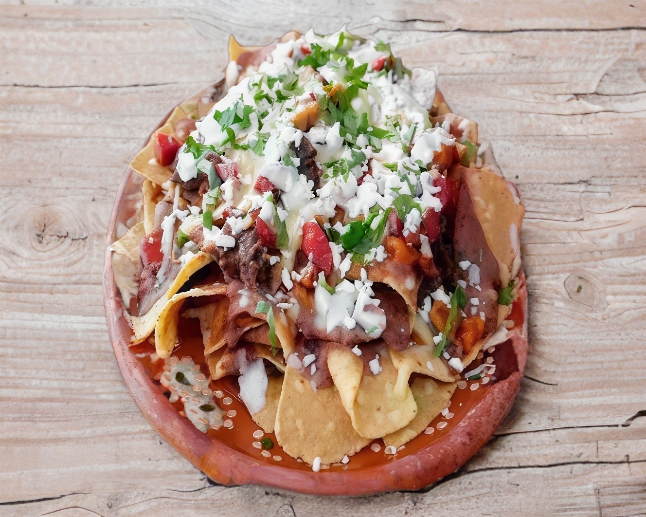 Totopos de maiz con asada, adobada y chorizo, bañados con frijoles fritos, cilantro, cebolla, queso fresco y queso gratinado