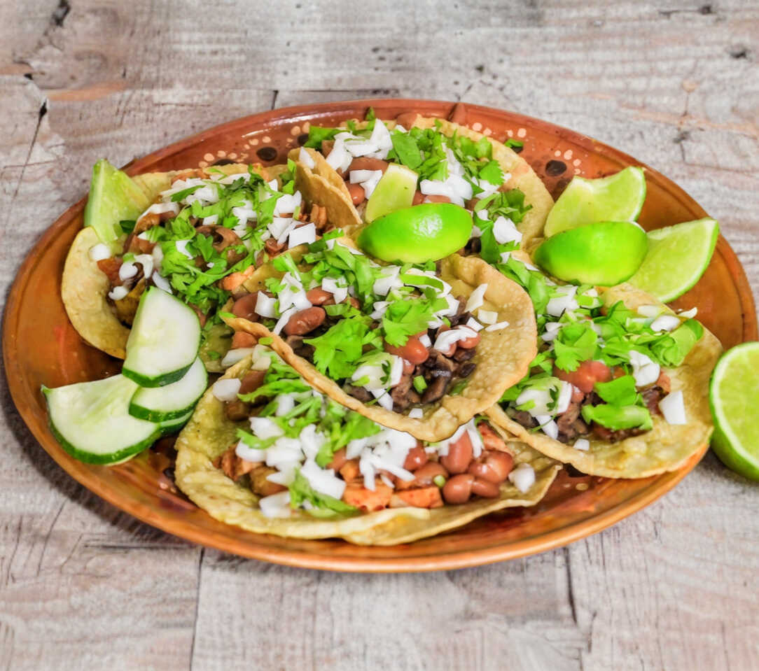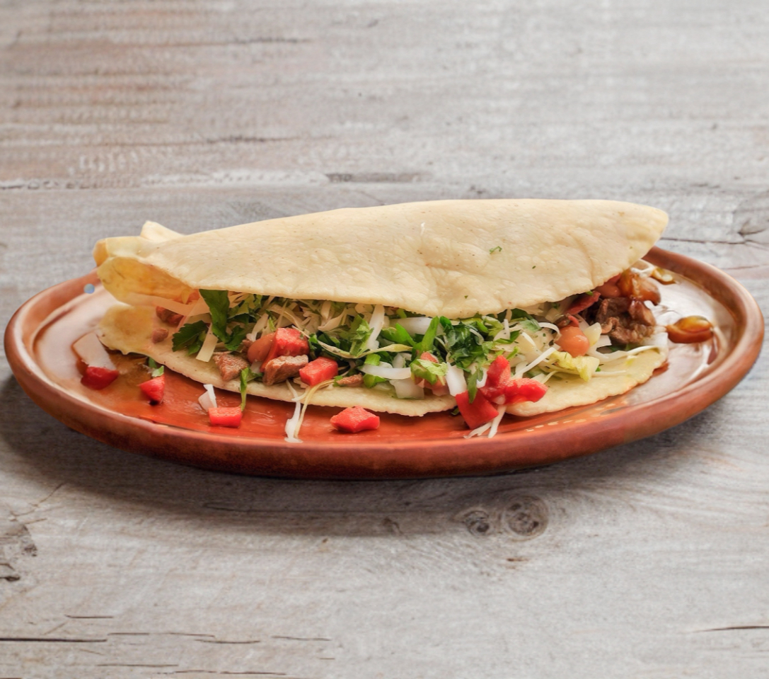 Tortilla gruesa de maíz hecha a mano, con frijoles, carne a elegir, lechuga, crema, queso y salsa al gusto. ¡Un clásico que nunca falla!