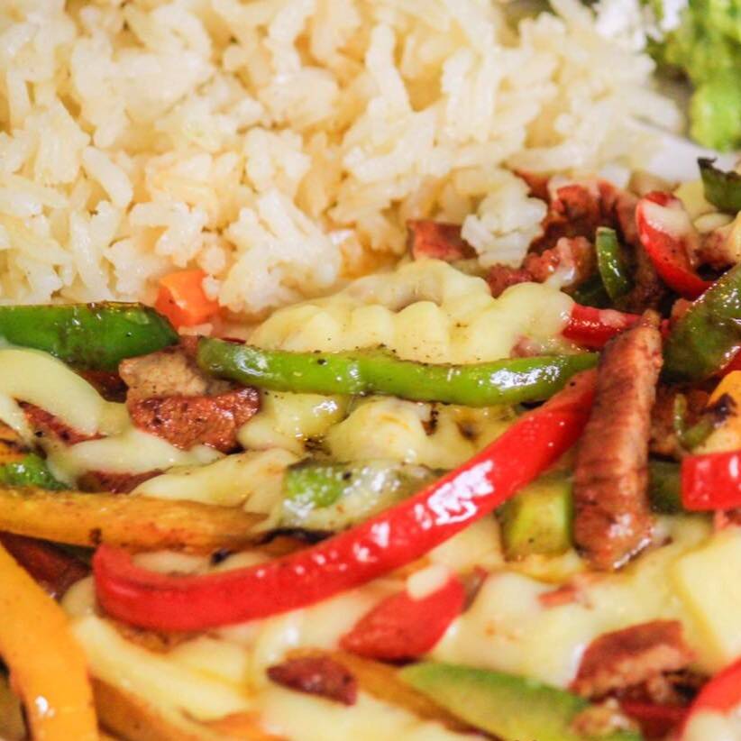Carne sirloin preparada con pimientos, cebolla, una porción de chorizo, y queso para gratinar acompañados de arroz y frijoles tortilla de maíz echa a mano