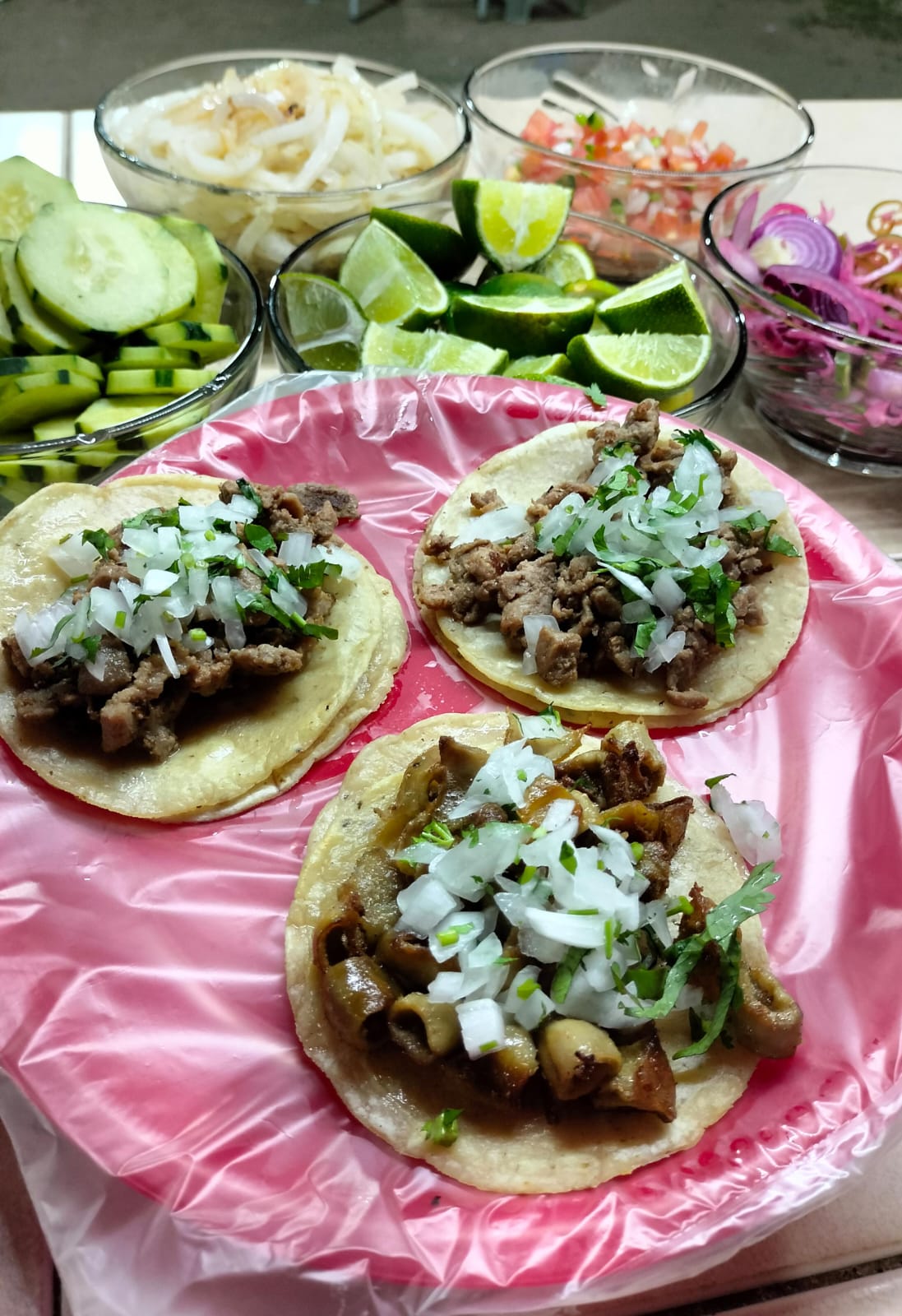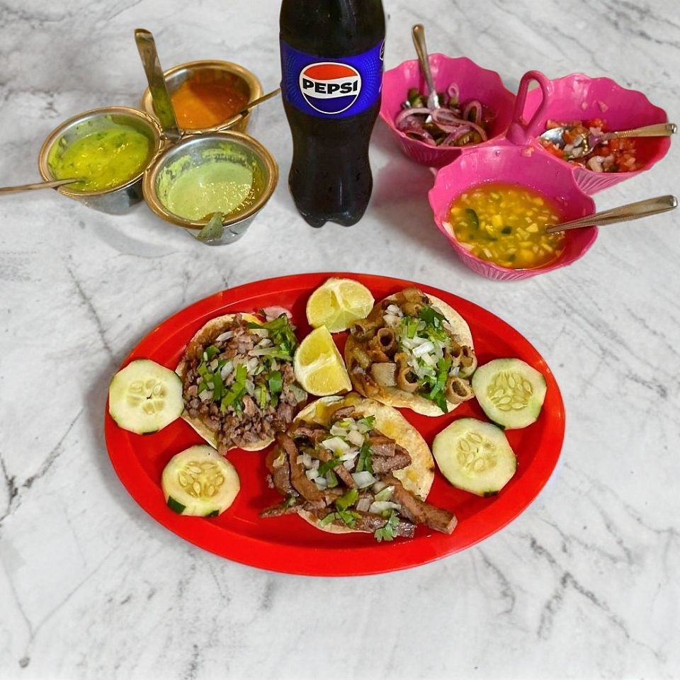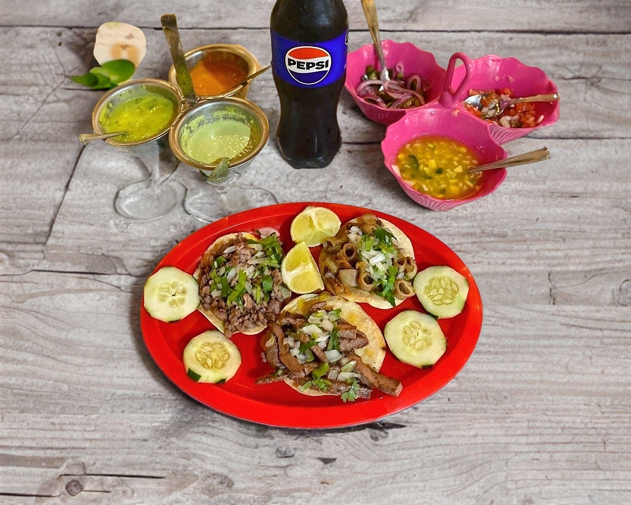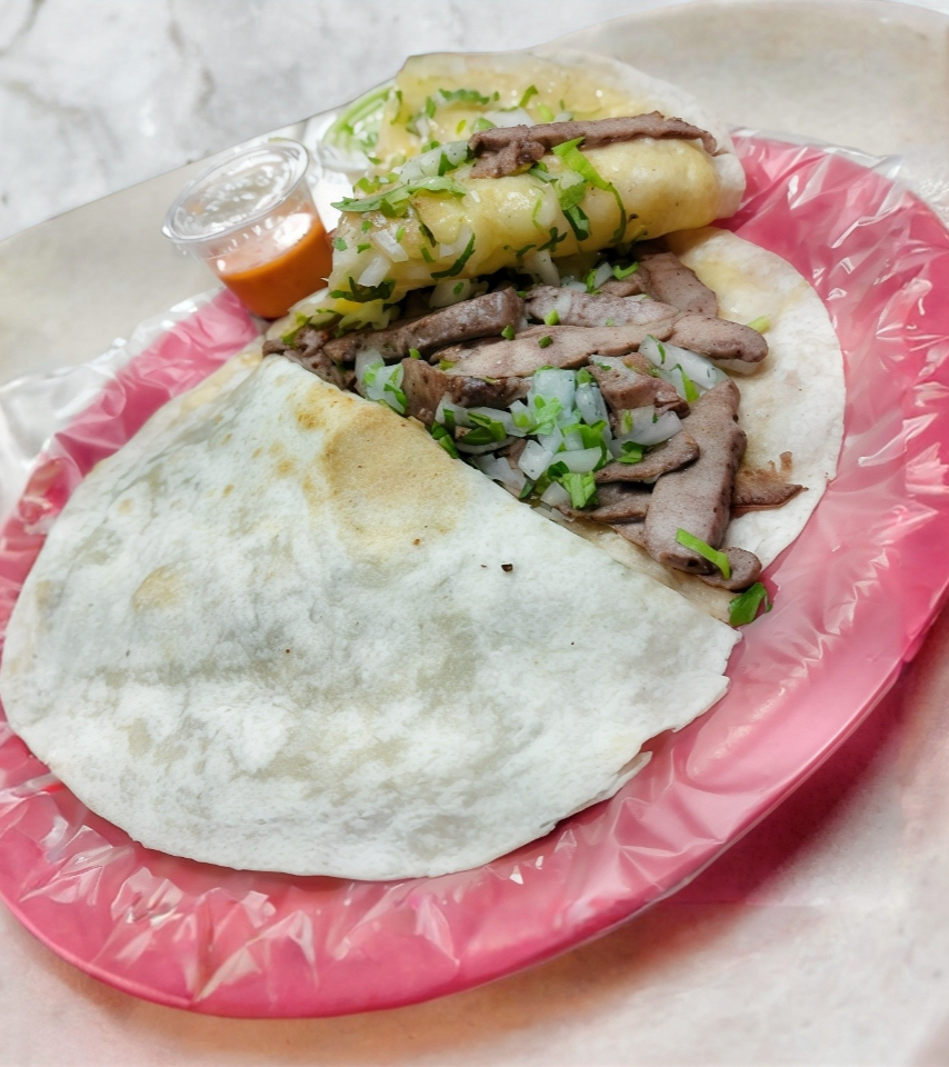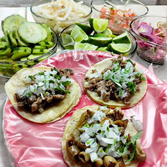 Carne pastor,asada,tripa y arrachera,tortilla arina,queso y aguacate