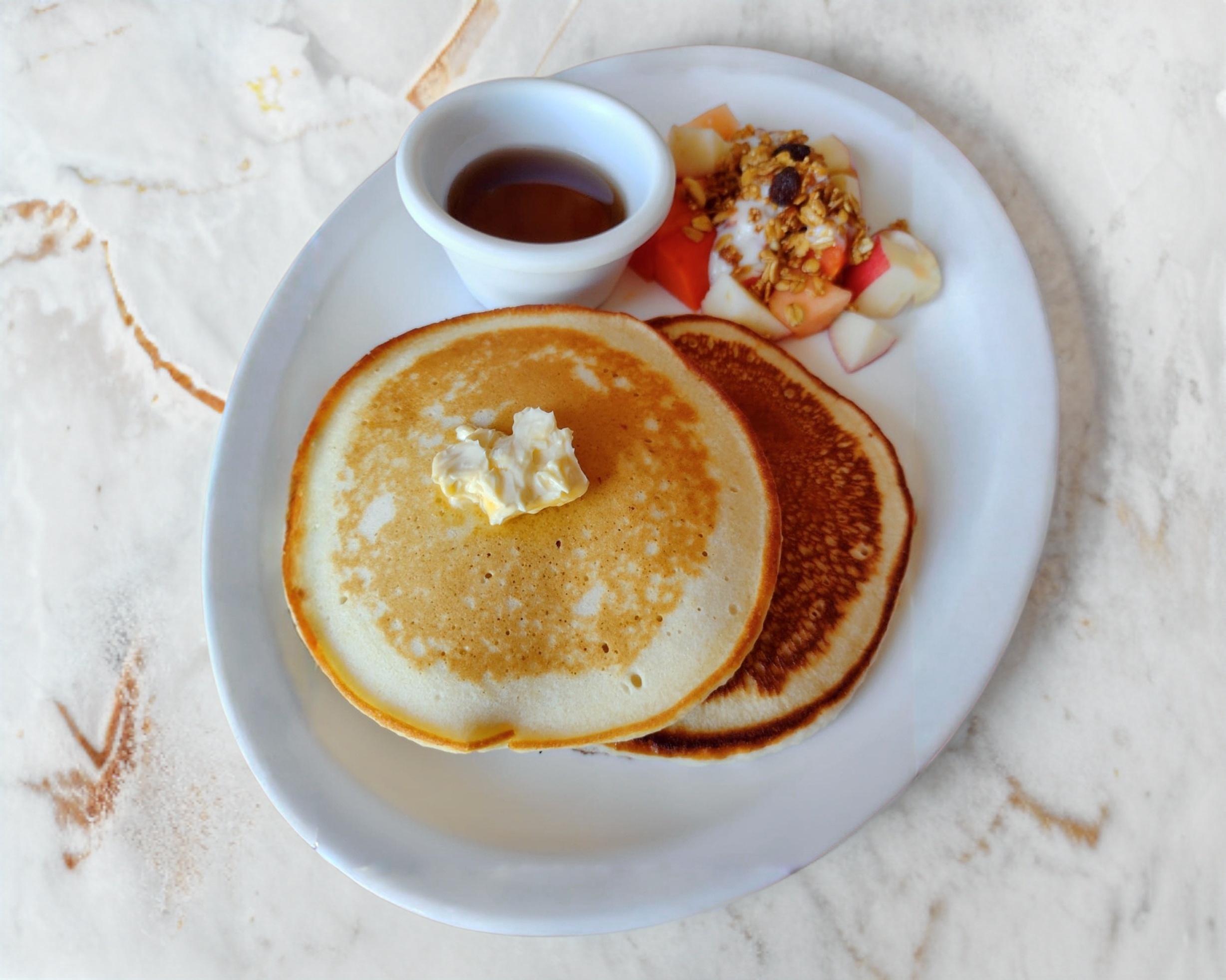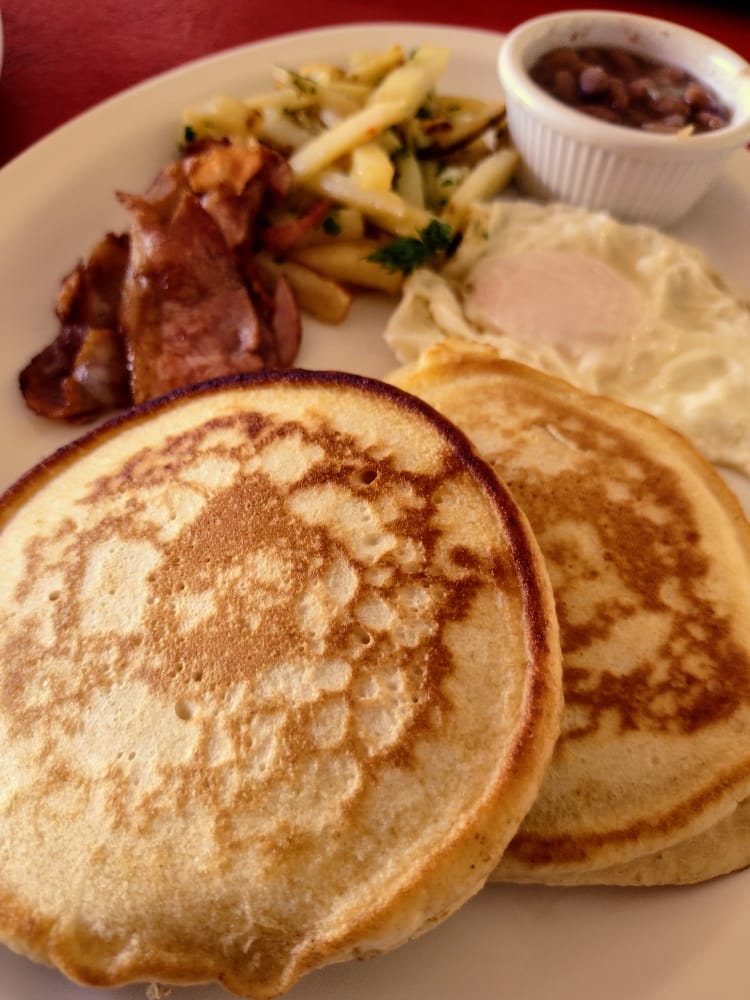 Huevo*1 + Tocino*1 + Papa salteada*1 + Frijoles*1 + Jugo del día.*1 + Café*1 + Hot-Cakes*1