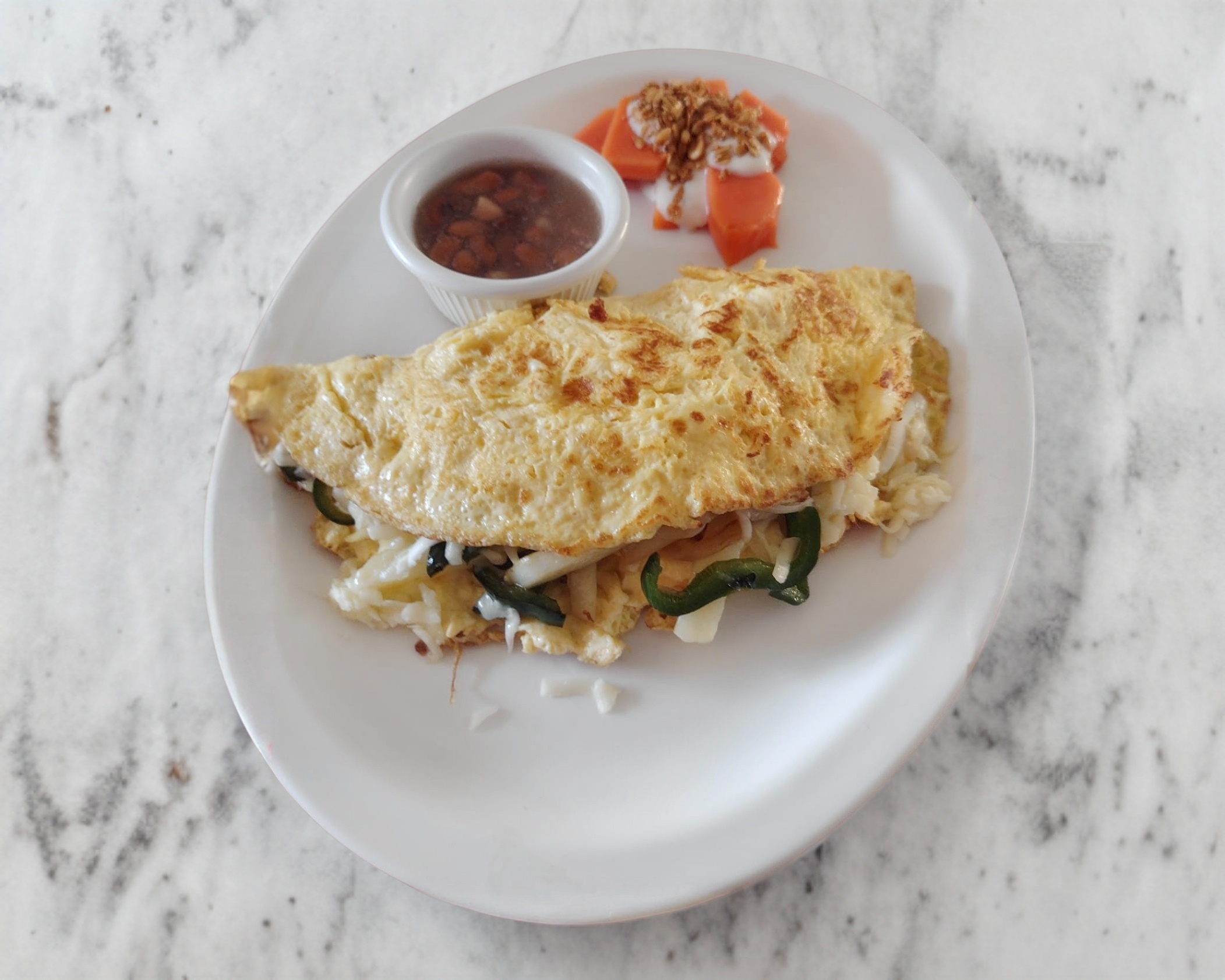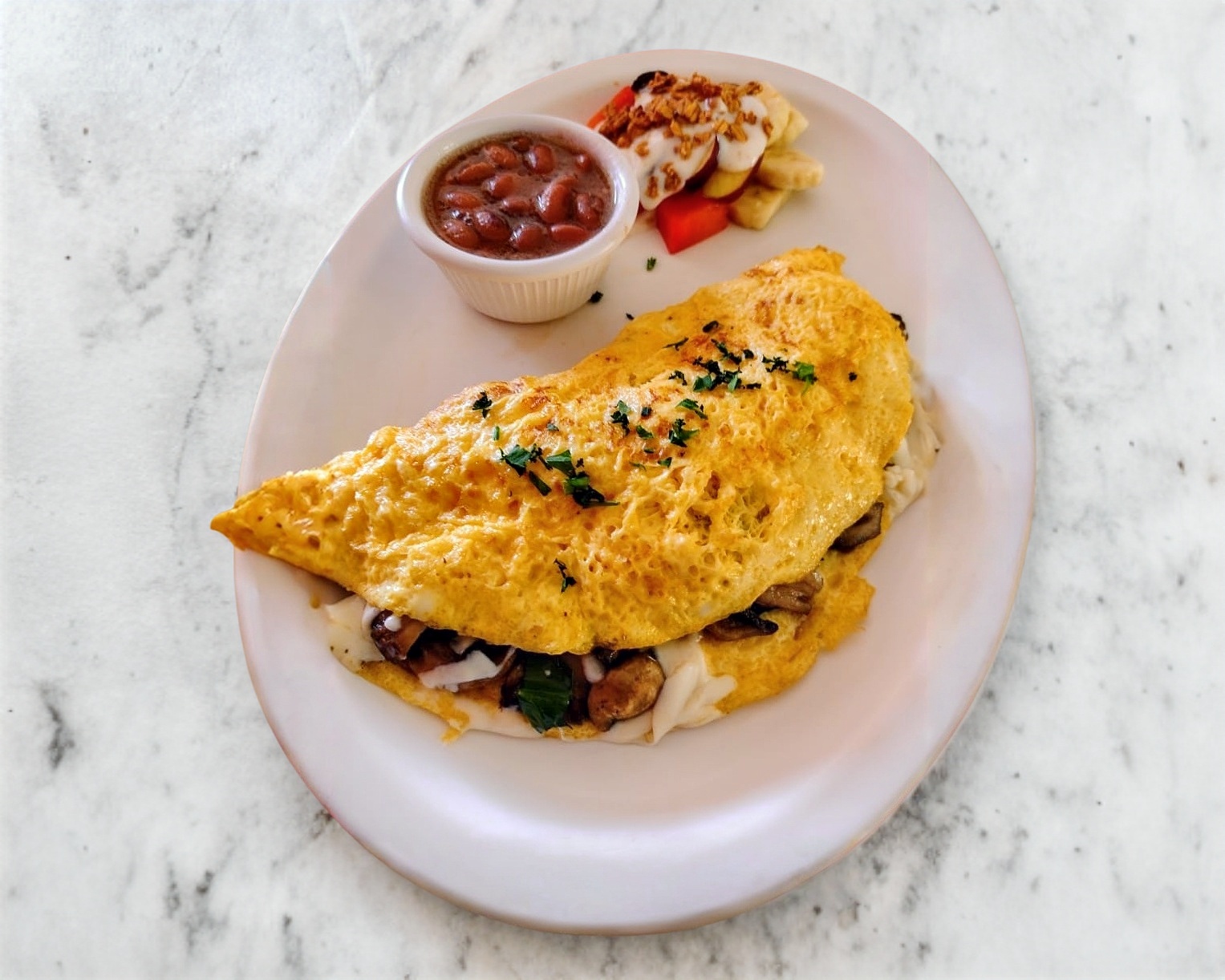 Champiñón, espinacas, cebolla, ajo y queso acompañado de frijoles y fruta.