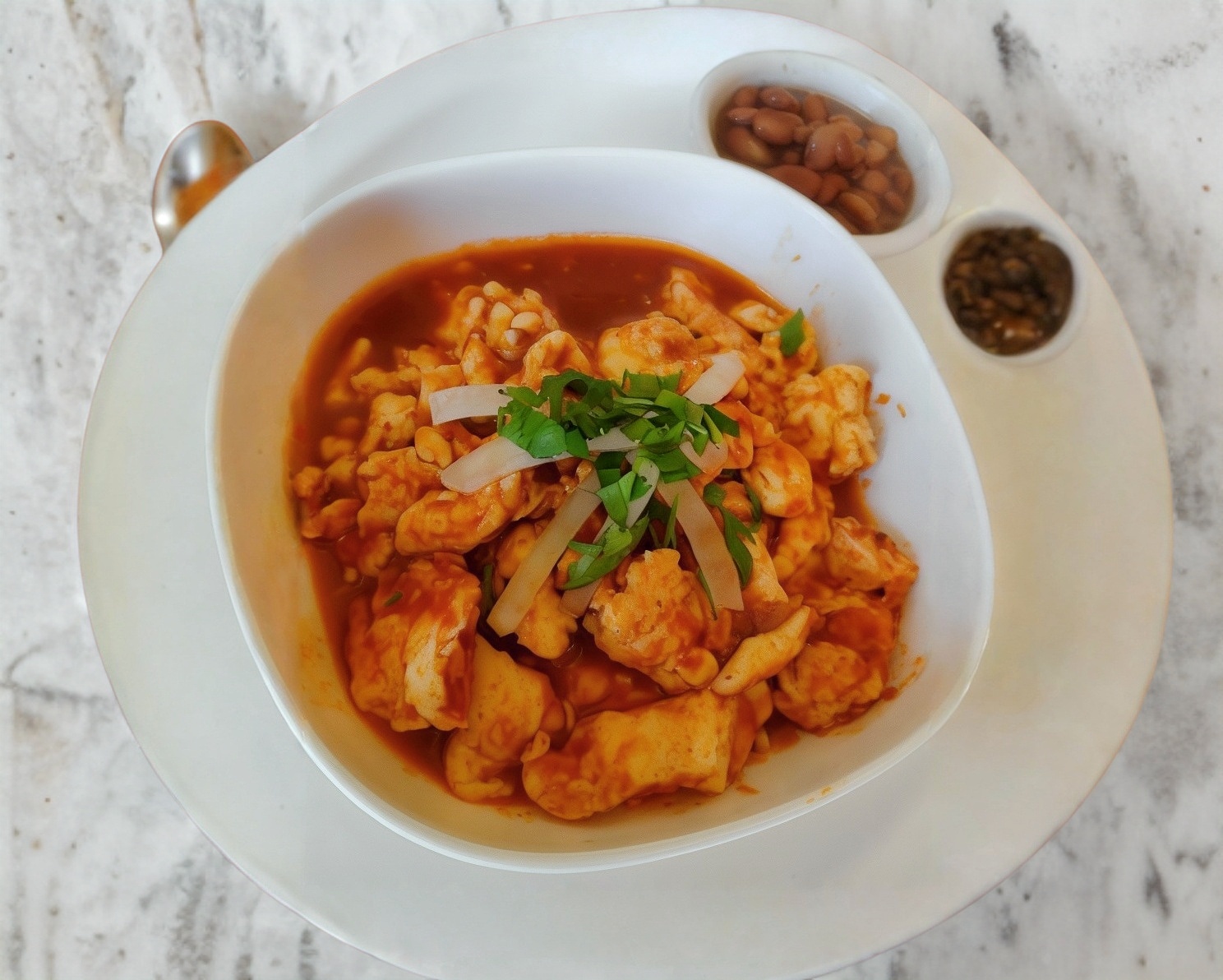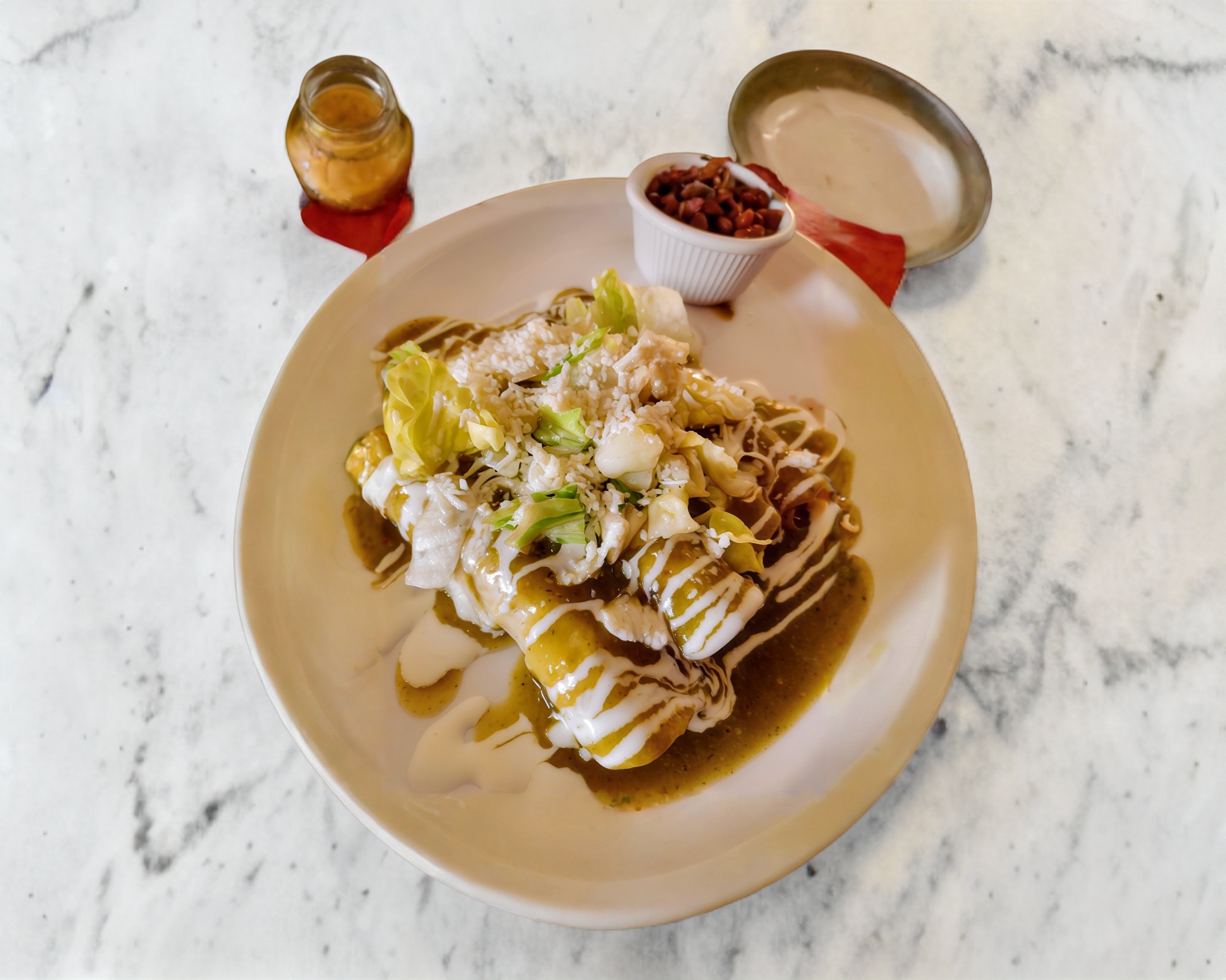 Deliciosas enchiladas con pollo, bañadas en salsa, con queso, crema, lechuga, cebolla y frijoles. Pídelas rojas o verdes.