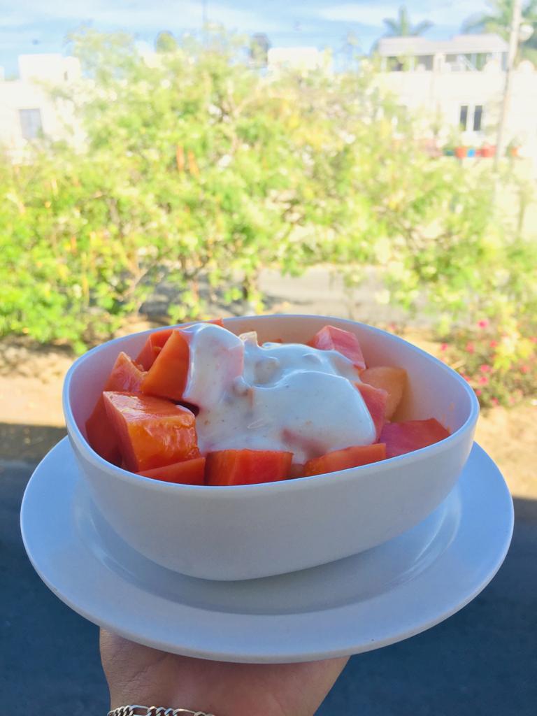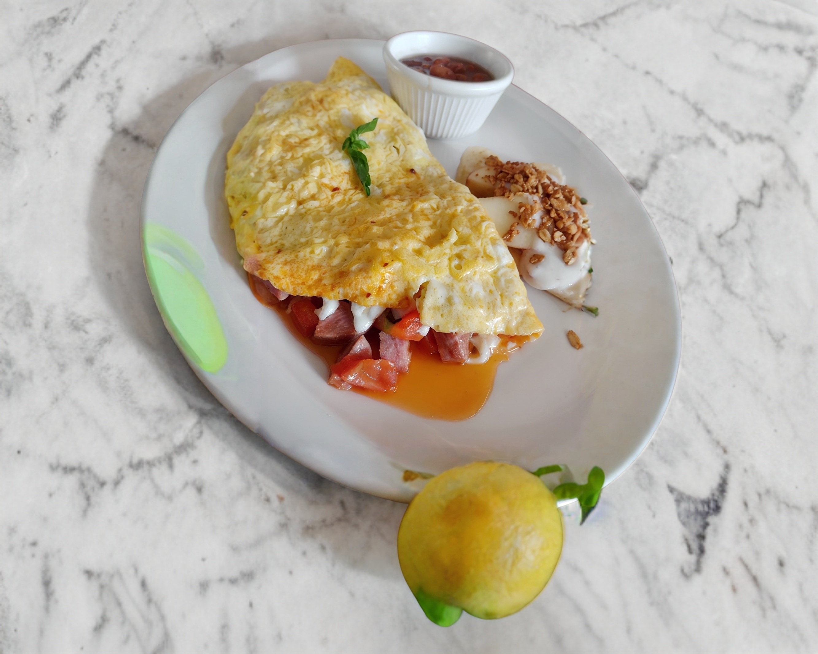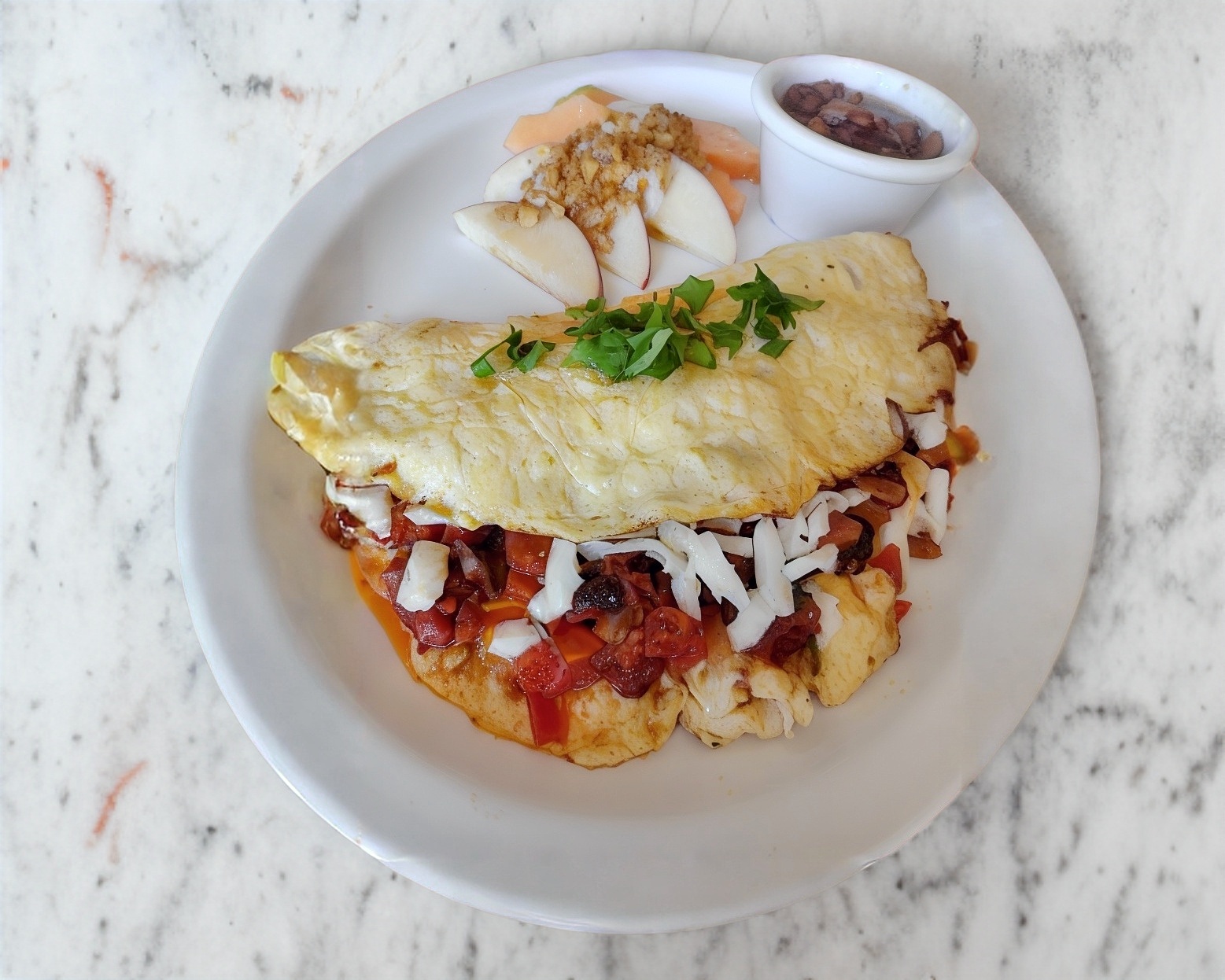 Jitomate, cebolla, ajo, albahaca, salchicha italiana y queso, acompañado de frijoles y fruta.