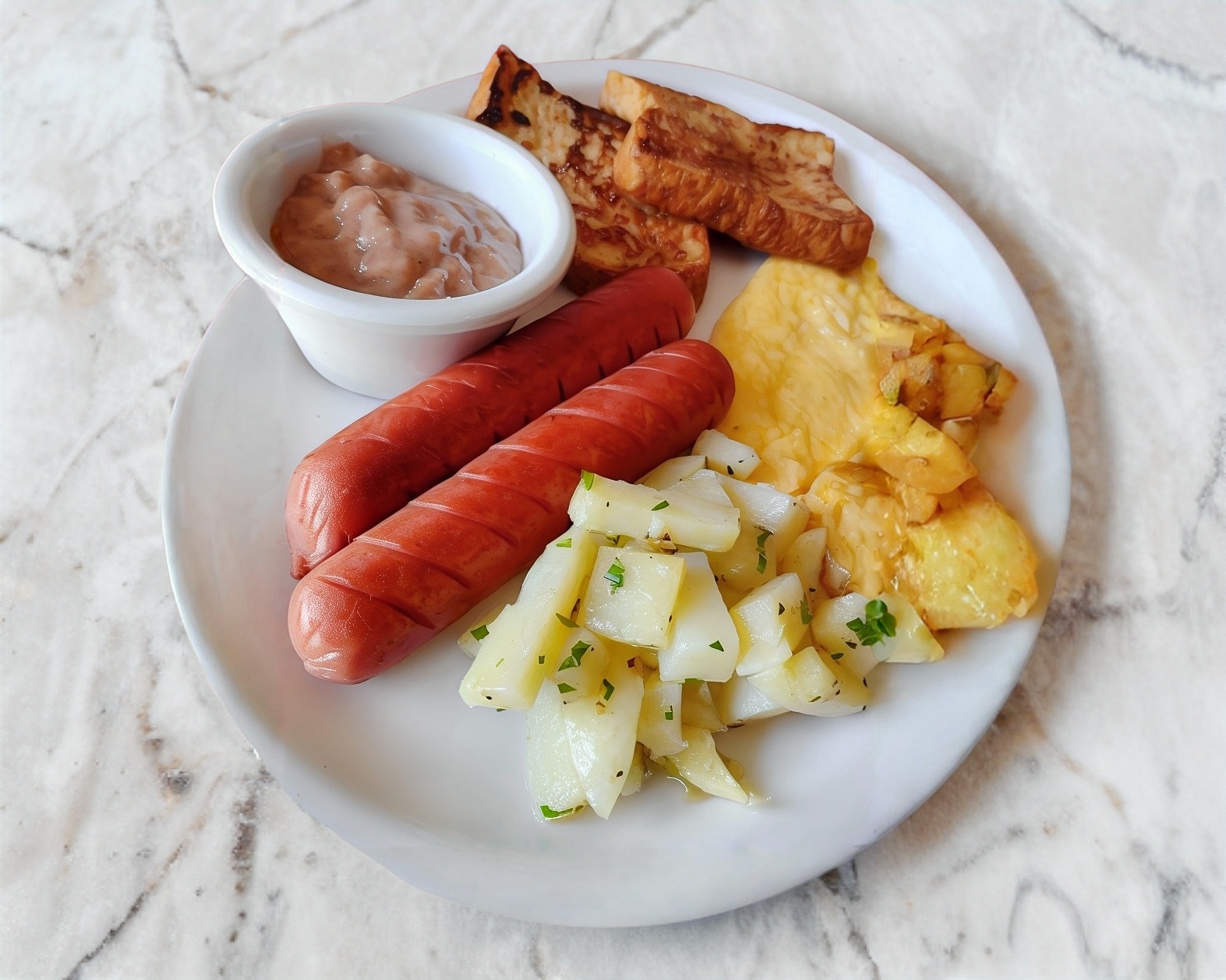 Fruta de temporada,pan frances,salchicha,papa salteada,huevo, frijoles, jugo de naranja y cafe.