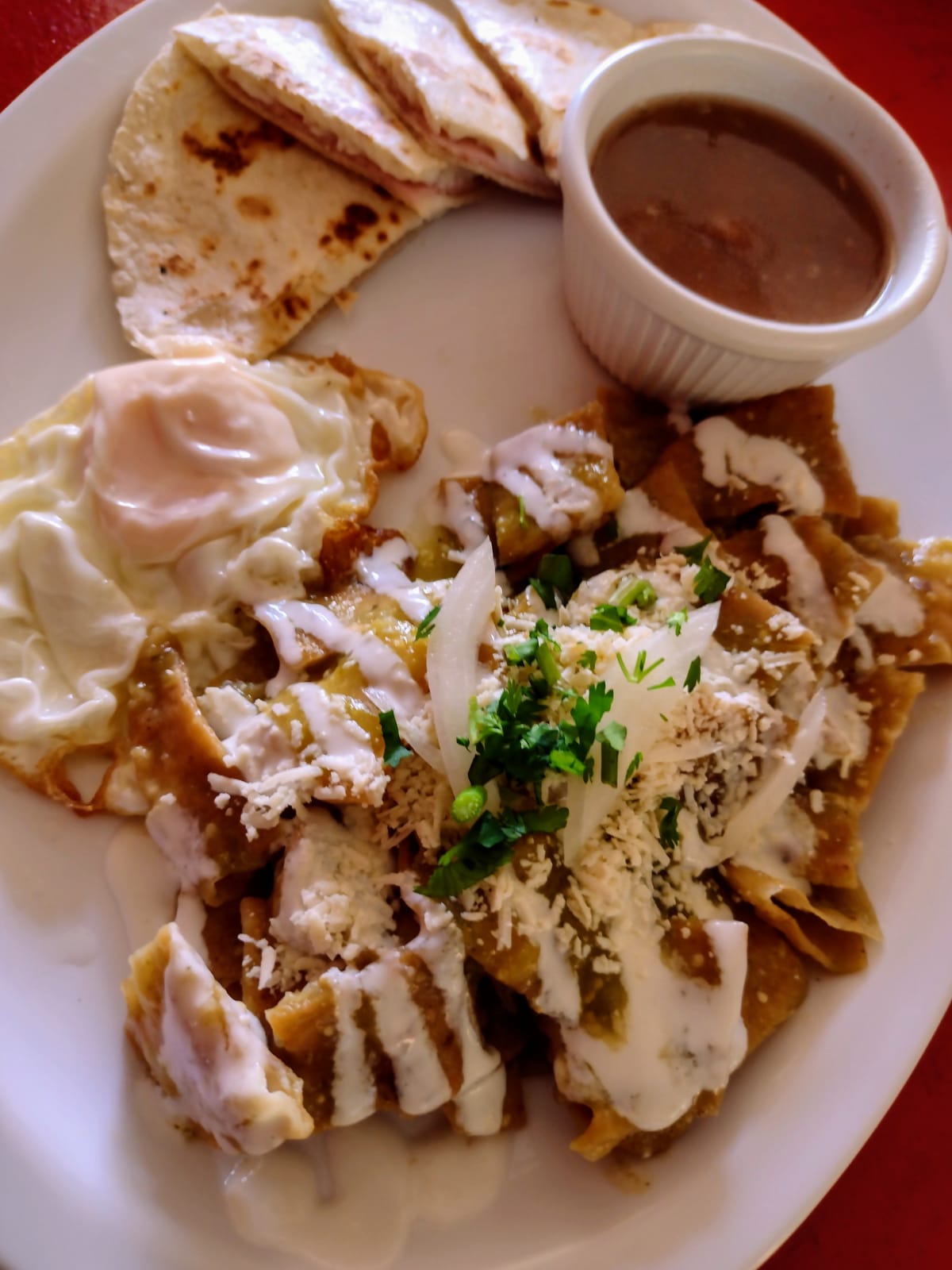 Deliciosos chilaquiles clásicos con crema, queso, cebolla, cilantro, acompañados con frijoles y salsa.
