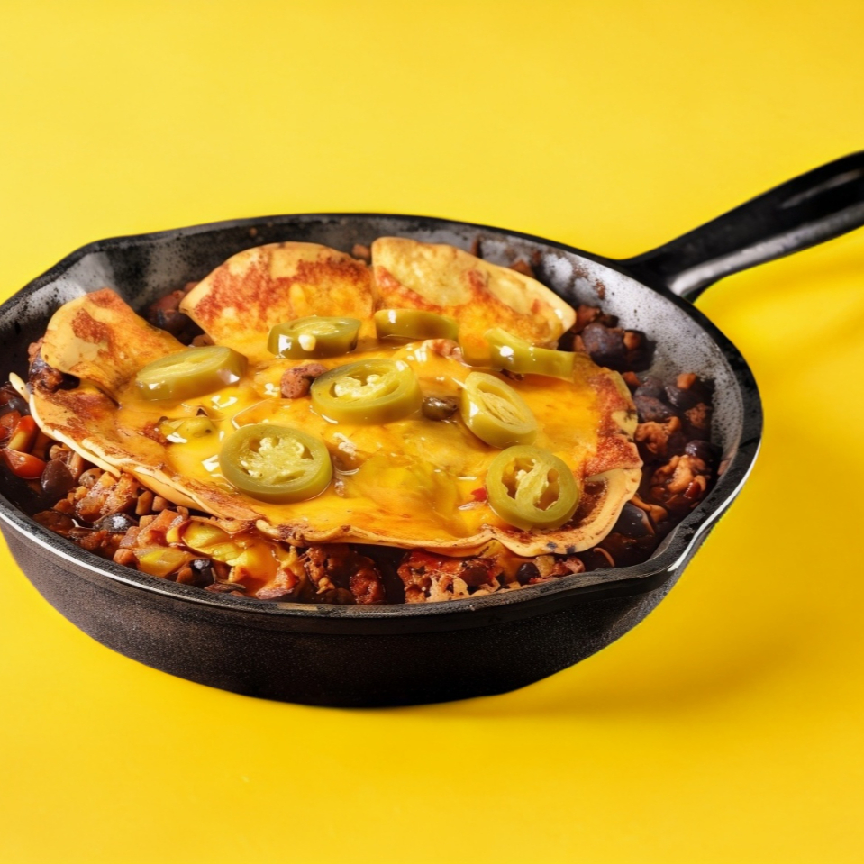 Totopos, frijoles, chorizo fritos, queso gratinado, pico de gallo y chiles jalapeños.