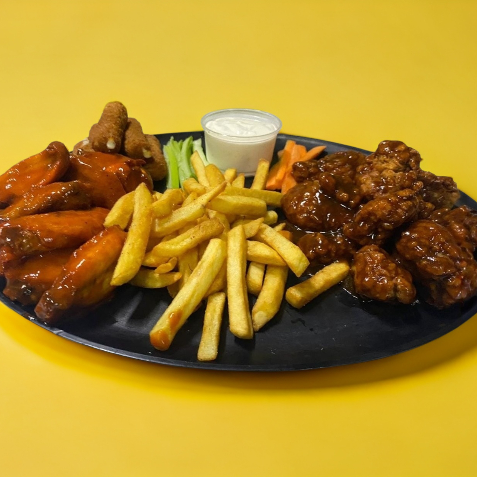 1 ord. alitas, 1 ord. boneless, 1 ord. papas fritas, 1 ord. dedos de queso, vegetales y aderezo.