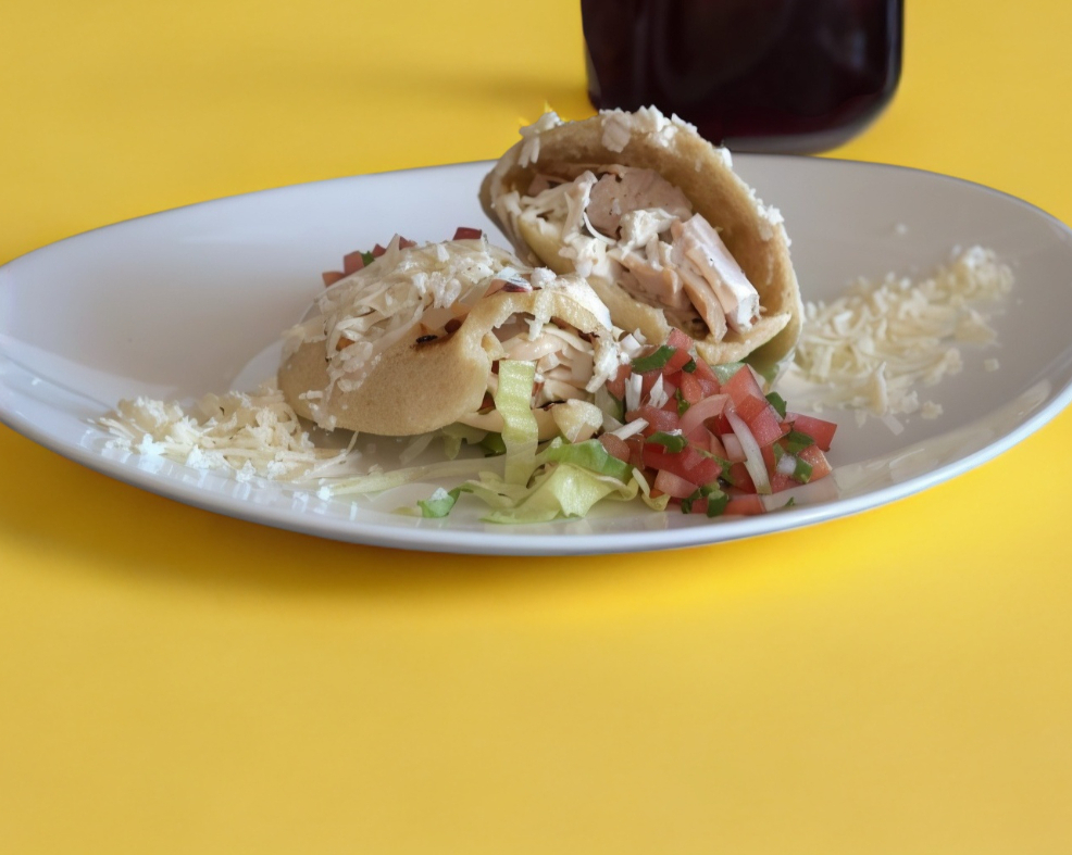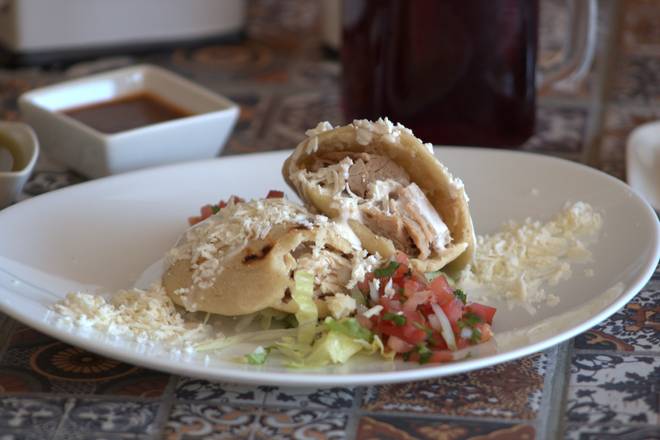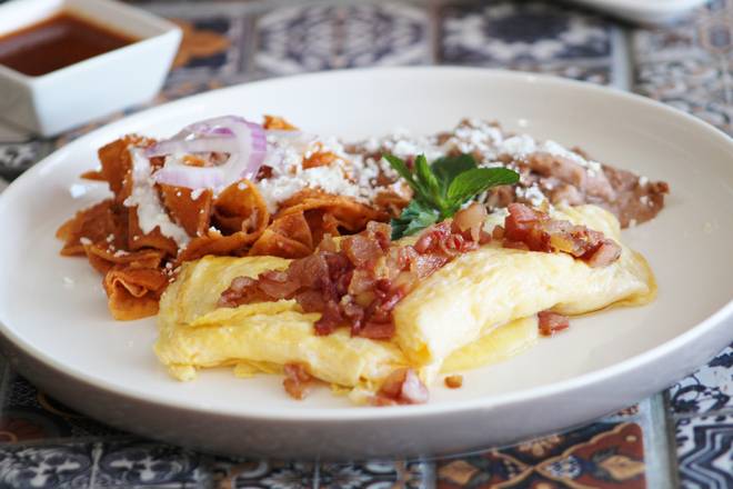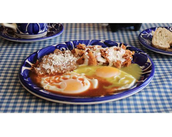 2 piezas con chilaquiles, frijoles y tortillas hechas a mano.