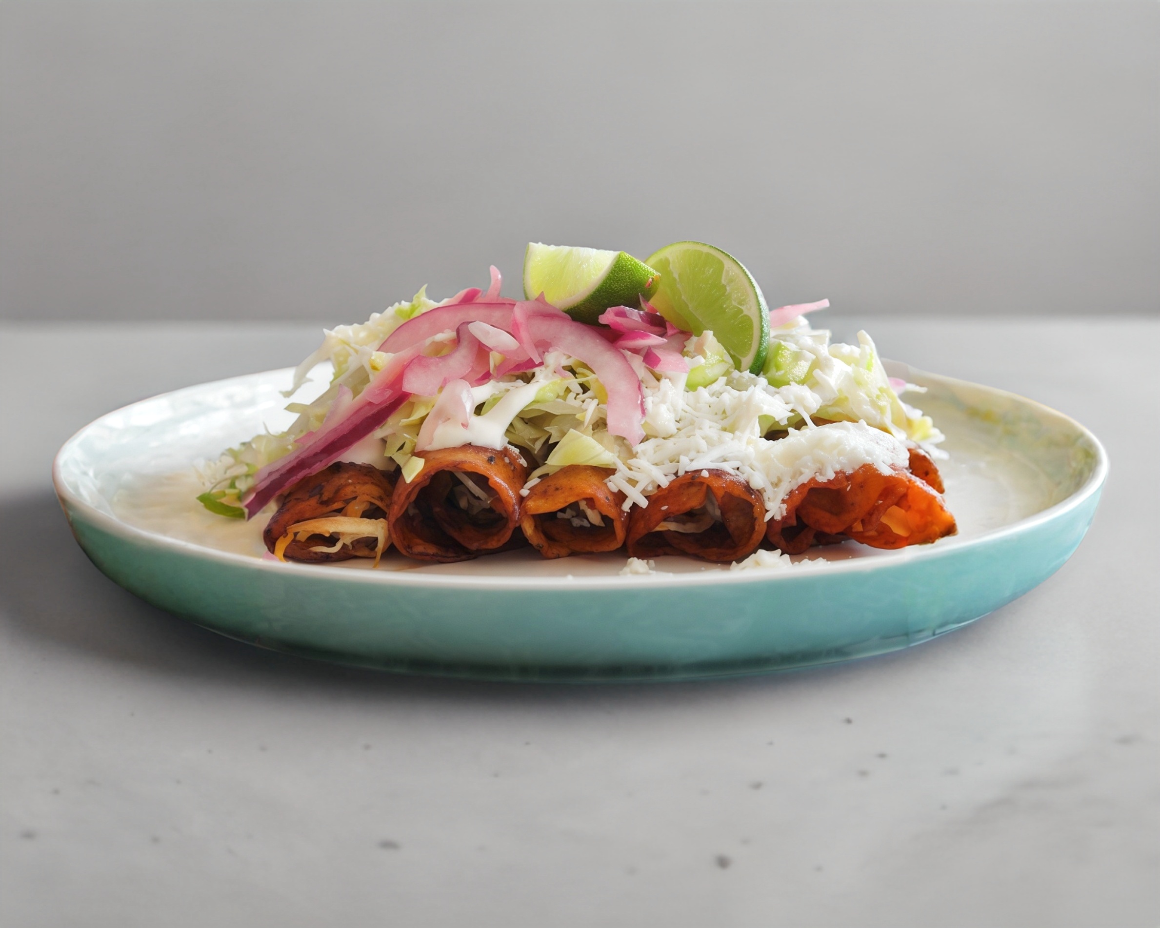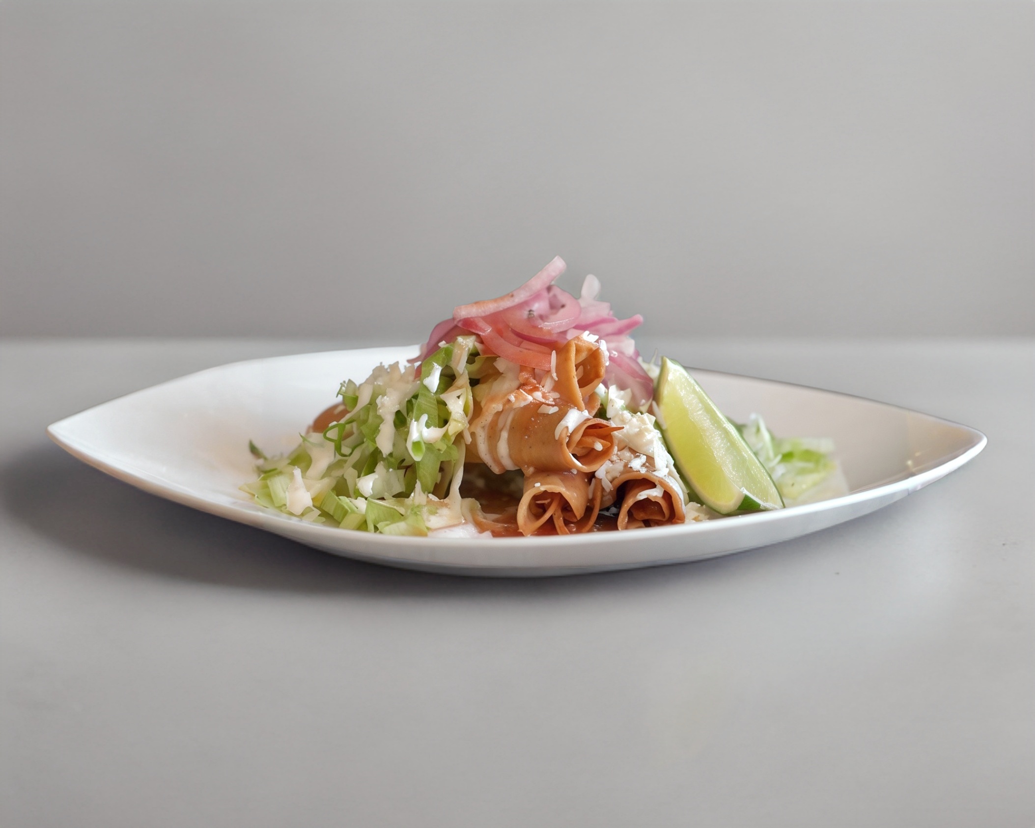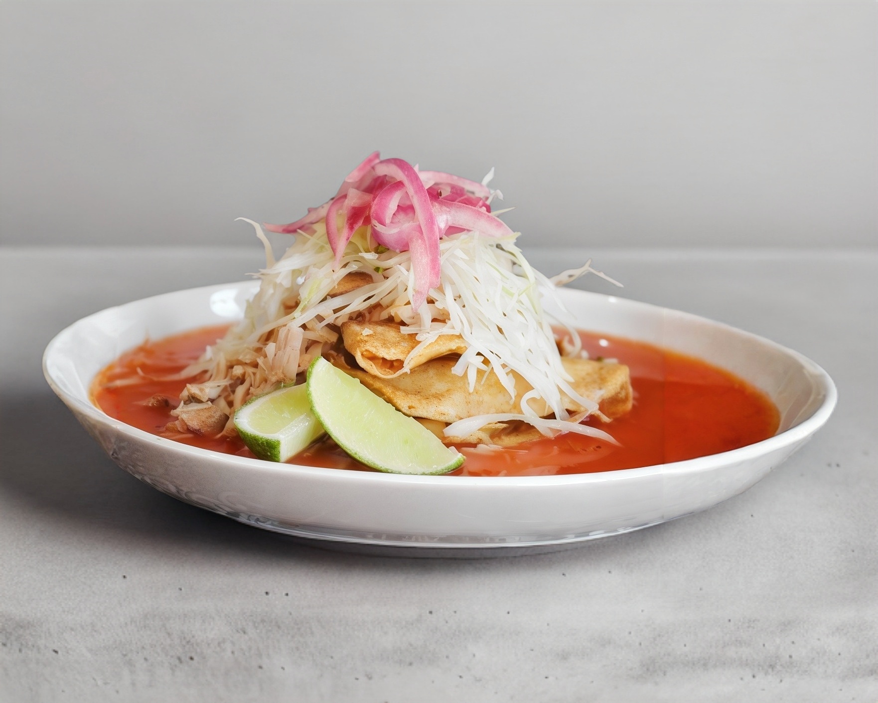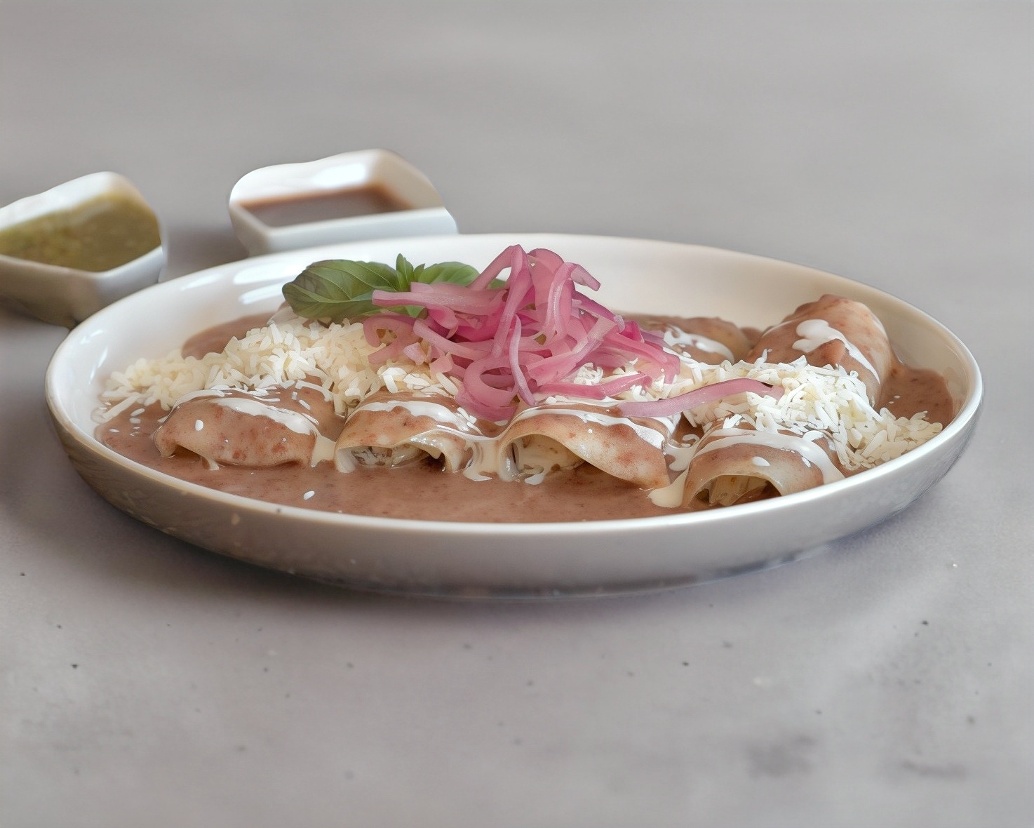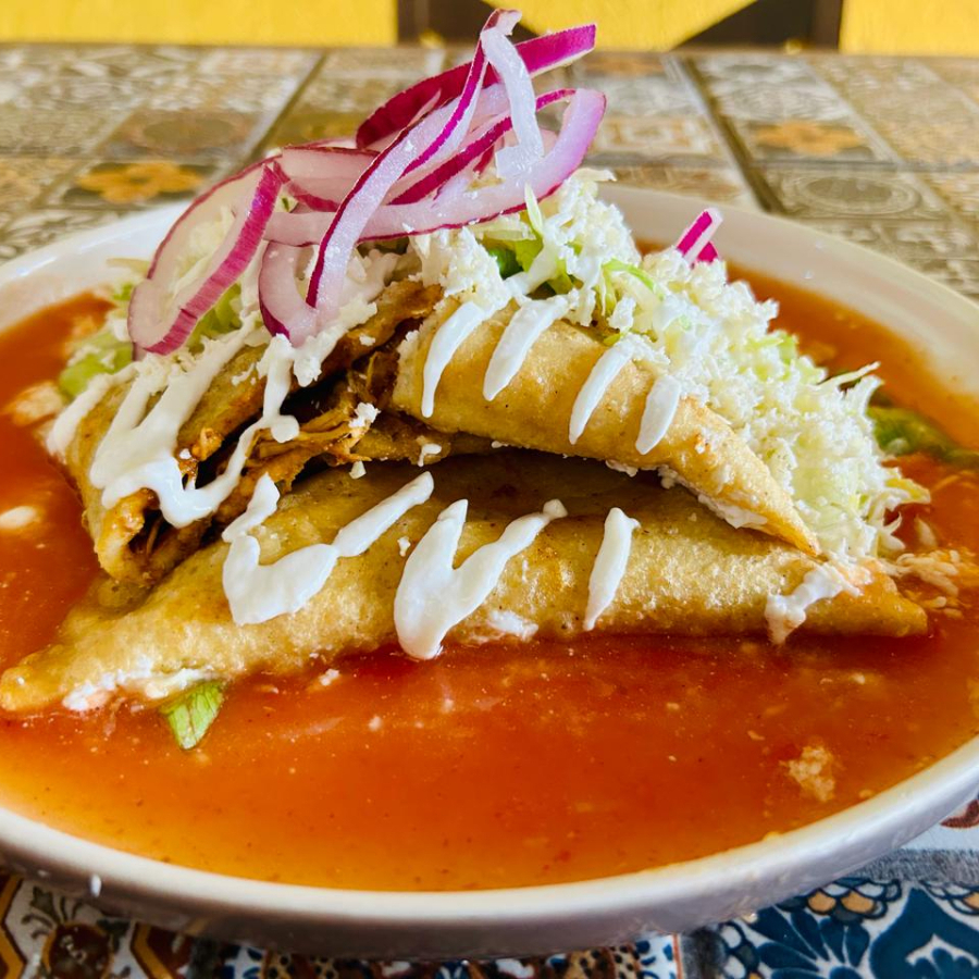 2 piezas sobre una tortilla frita bañados en salsa acompañados de chilaquiles, frijoles y tortillas hechas a mano.
