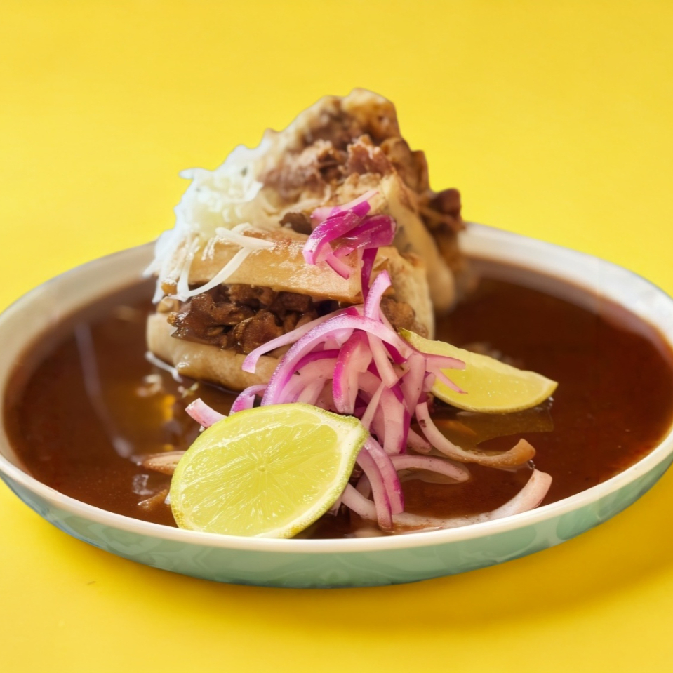 con consomé de birria, cebolla, sala de jitomate y chile