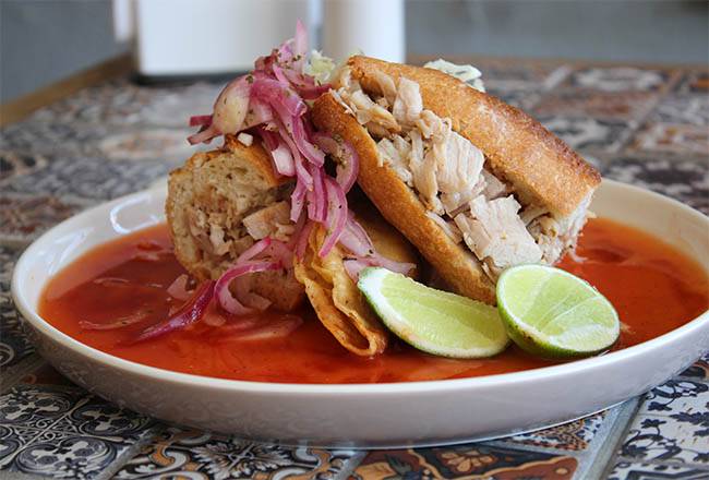 Con col, cebolla desflemada, limón y salsa de jitomate y chile.