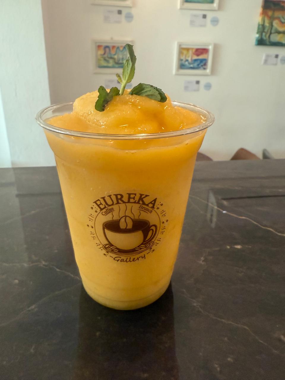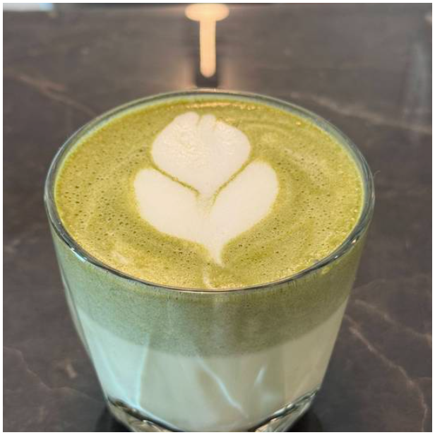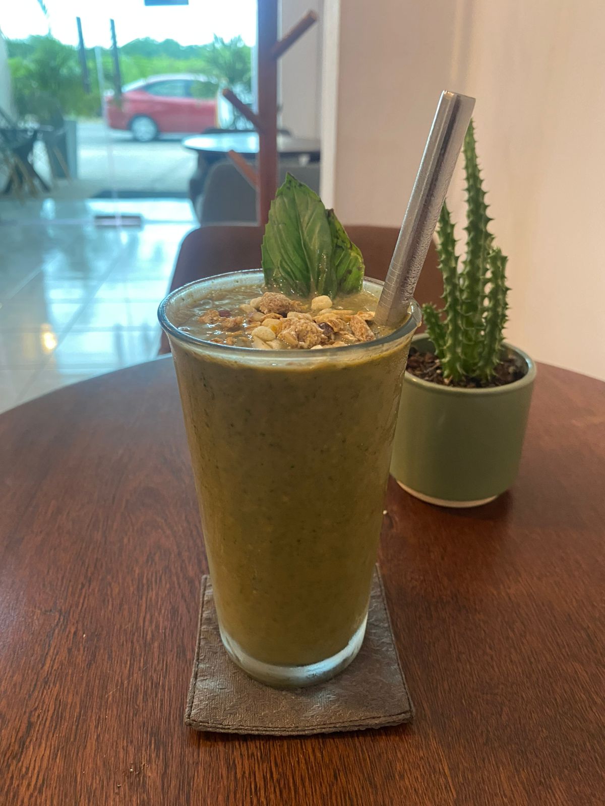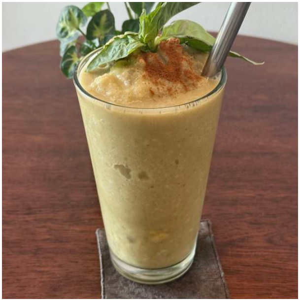 Frappeado de matcha con mango, plátano, canela y leche de coco