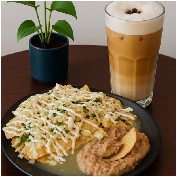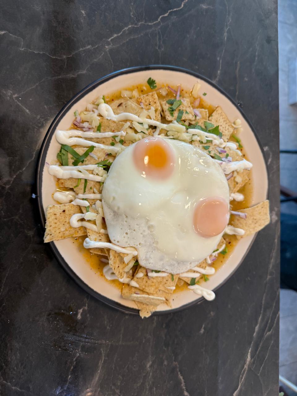 Ricos Totopos bañados en salsa verde, queso, crema, cebolla, cilantro, puede ser con pollo, o huevo al gusto