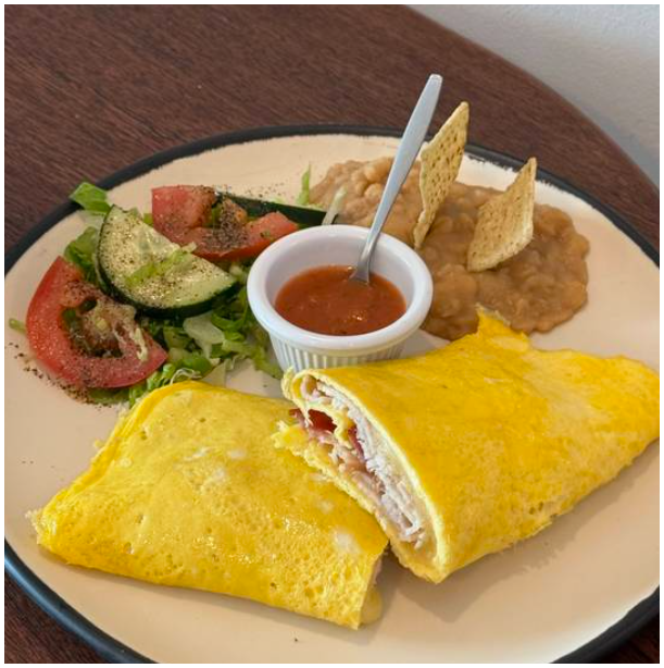 Jamón, queso, tocino, espinaca, cebolla y jitomate.