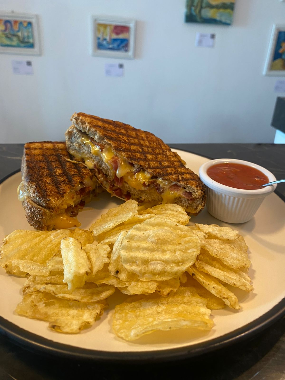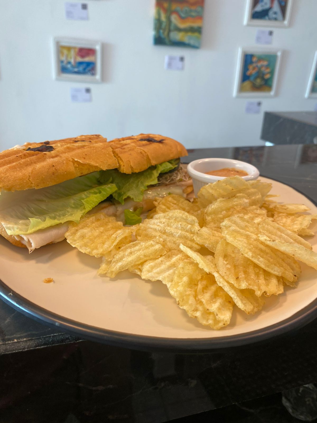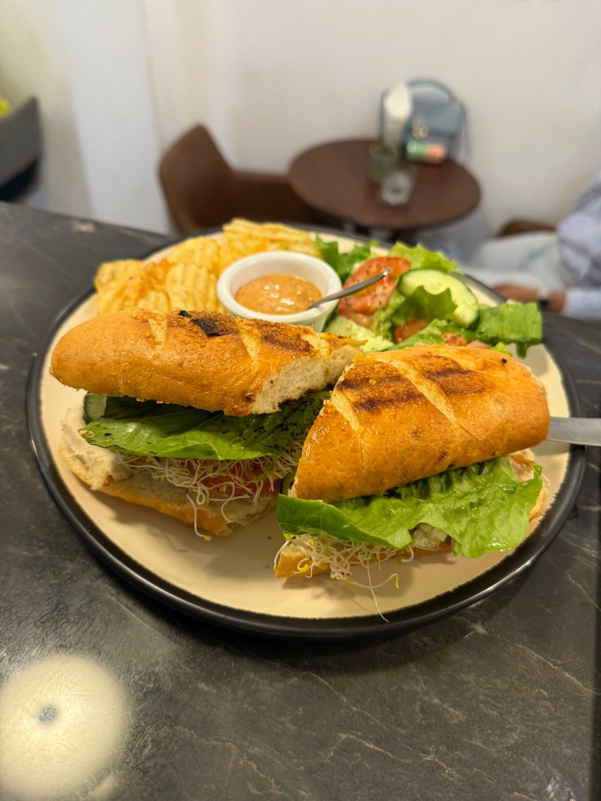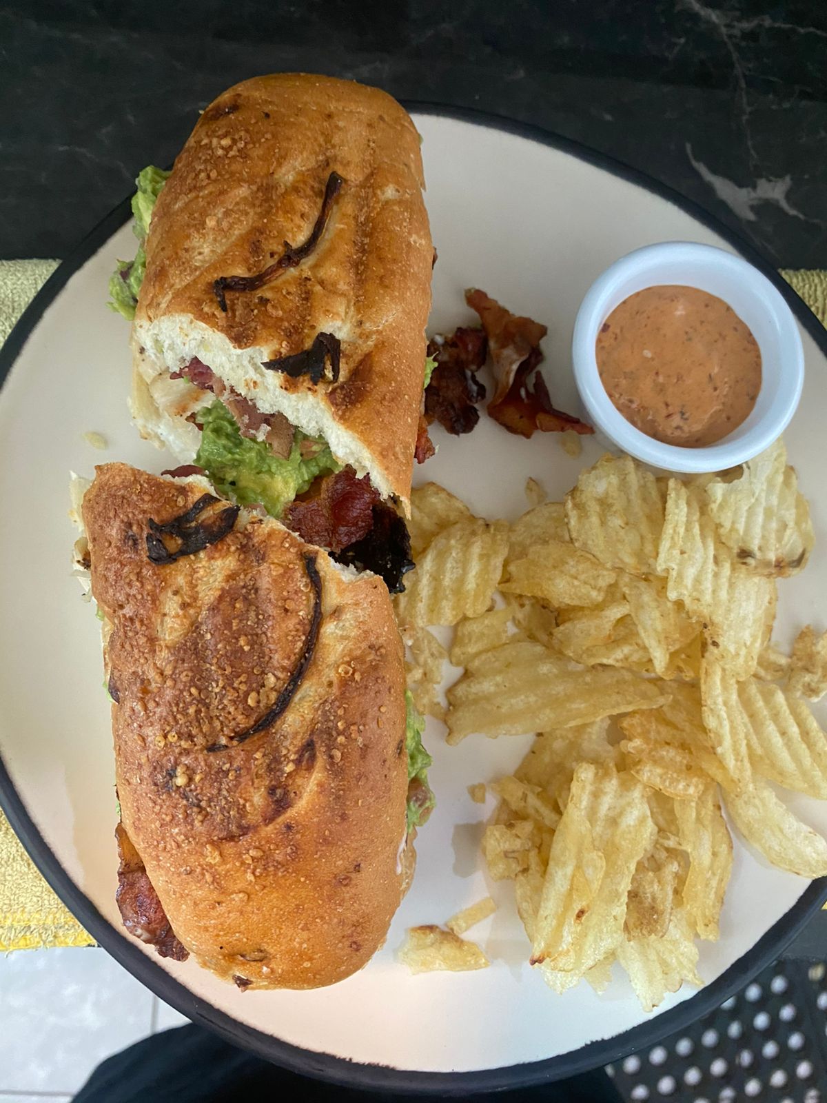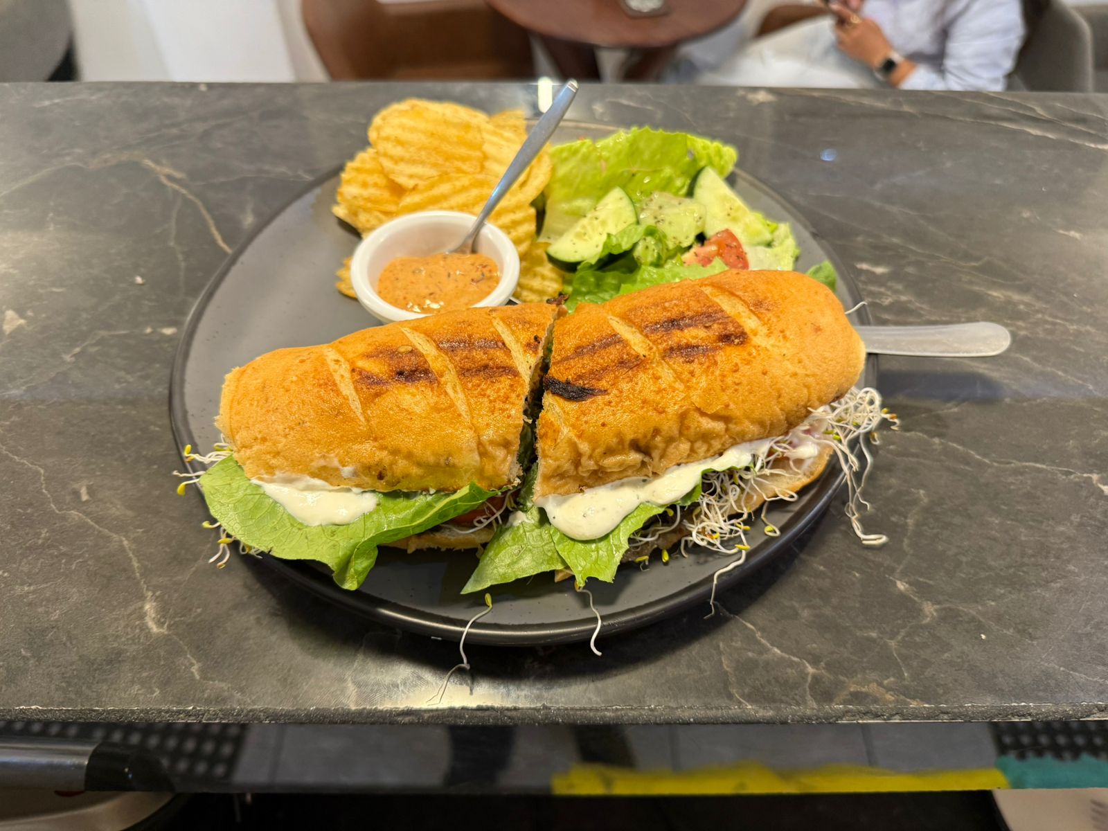 Pan a elegir, ajo cebolla, chipotle y finas hierbas, con jitomate, pepino, lechuga y germinado de alfalfa acompañado con papas fritas