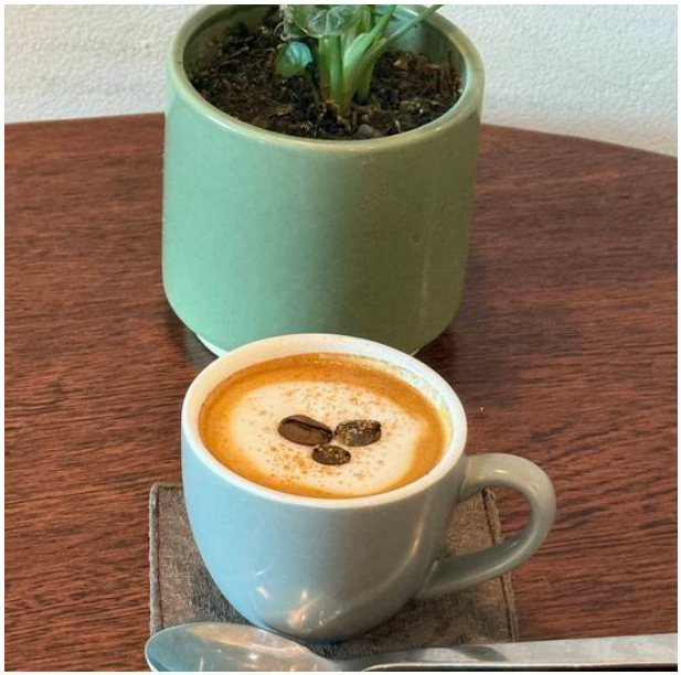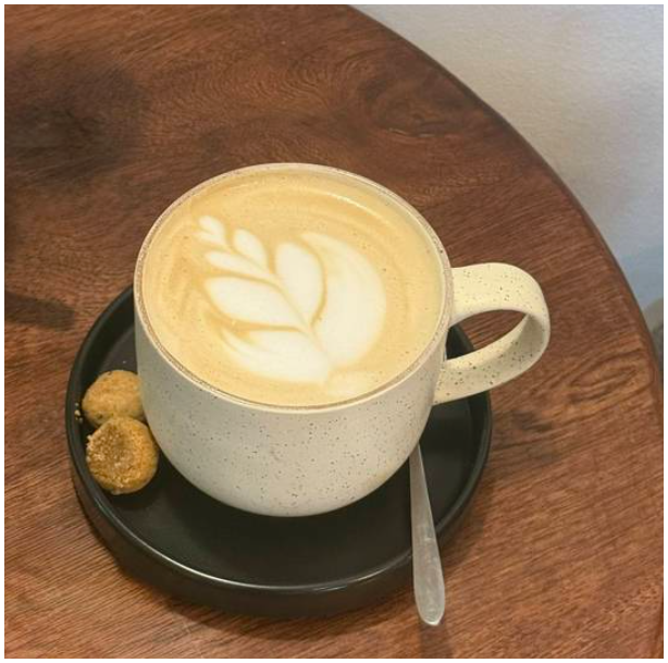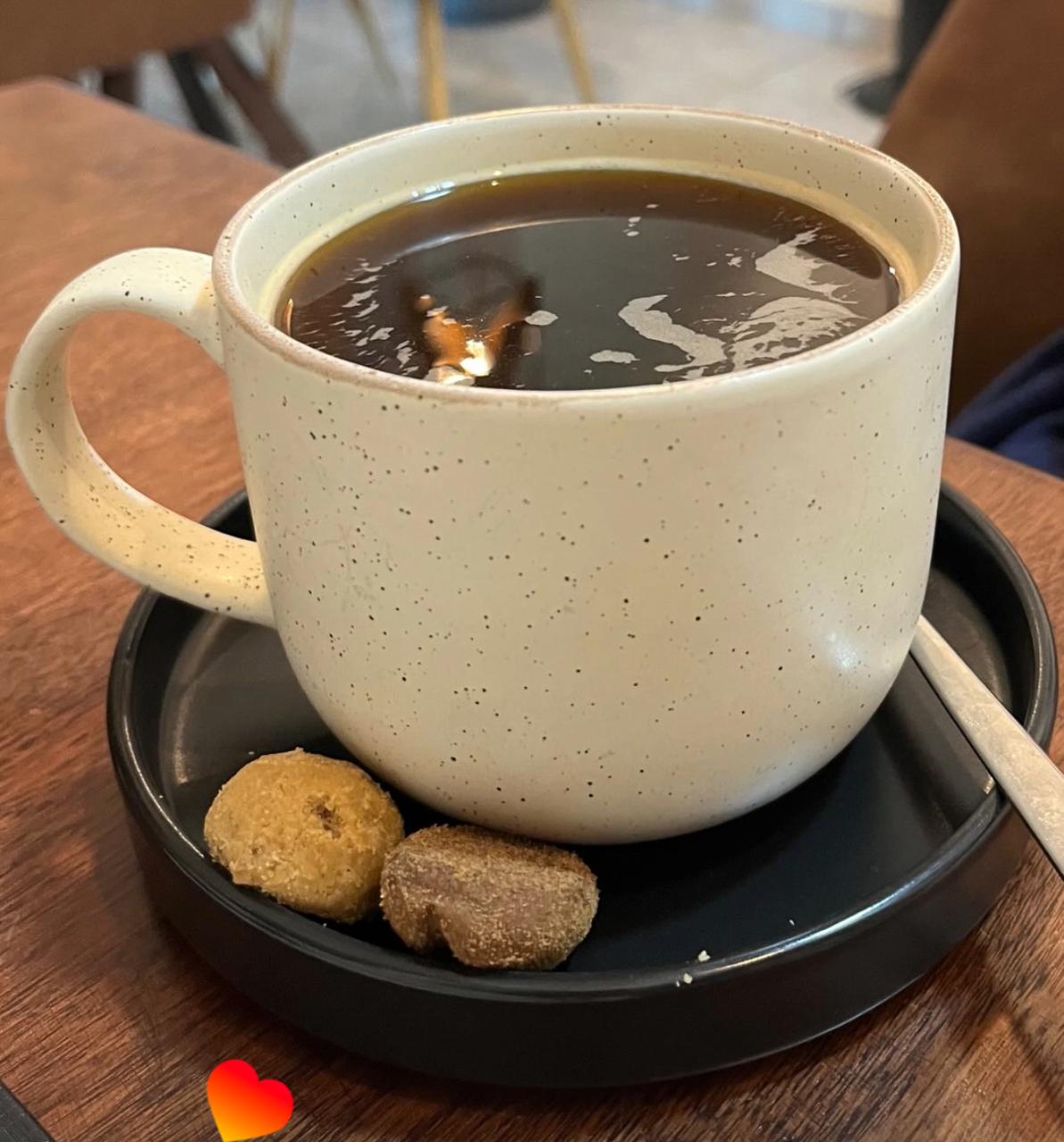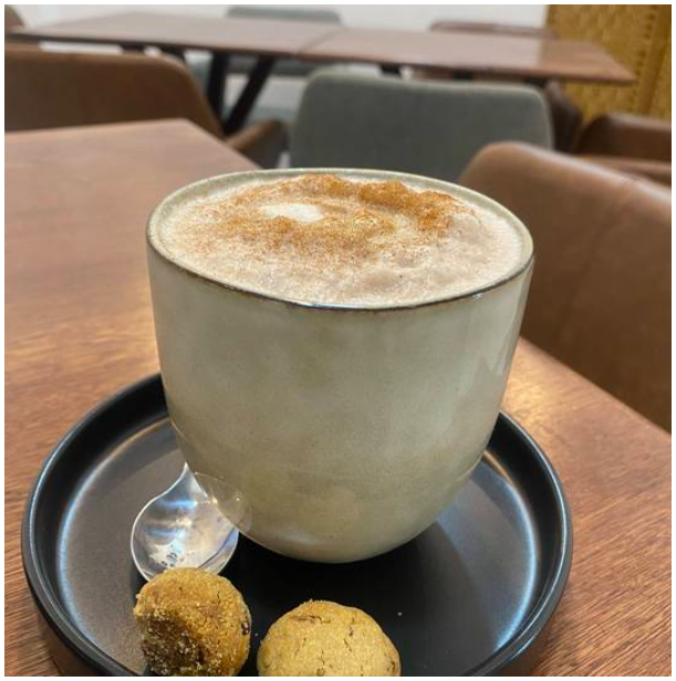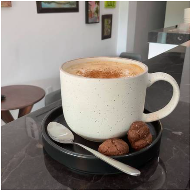 Espresso, con un toque de leche cremada, canela y dos granos enteros