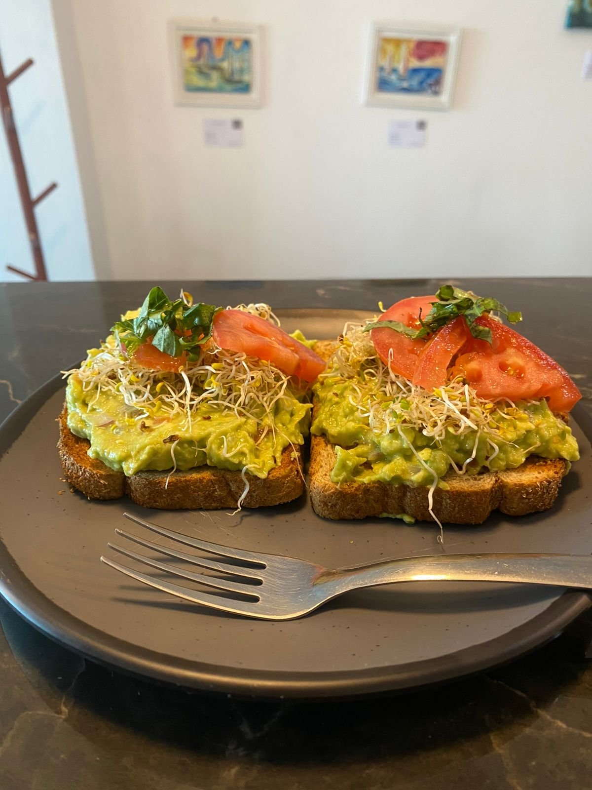Pan tostado, con nuestro guacamole de la casa, jitomate fresco, germinado y un toque de aceite de oliva.