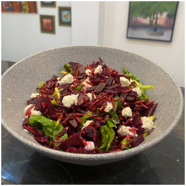 Vinagreta de limón, arugula, espinaca, queso de cabra, betabel cocido y horneado.