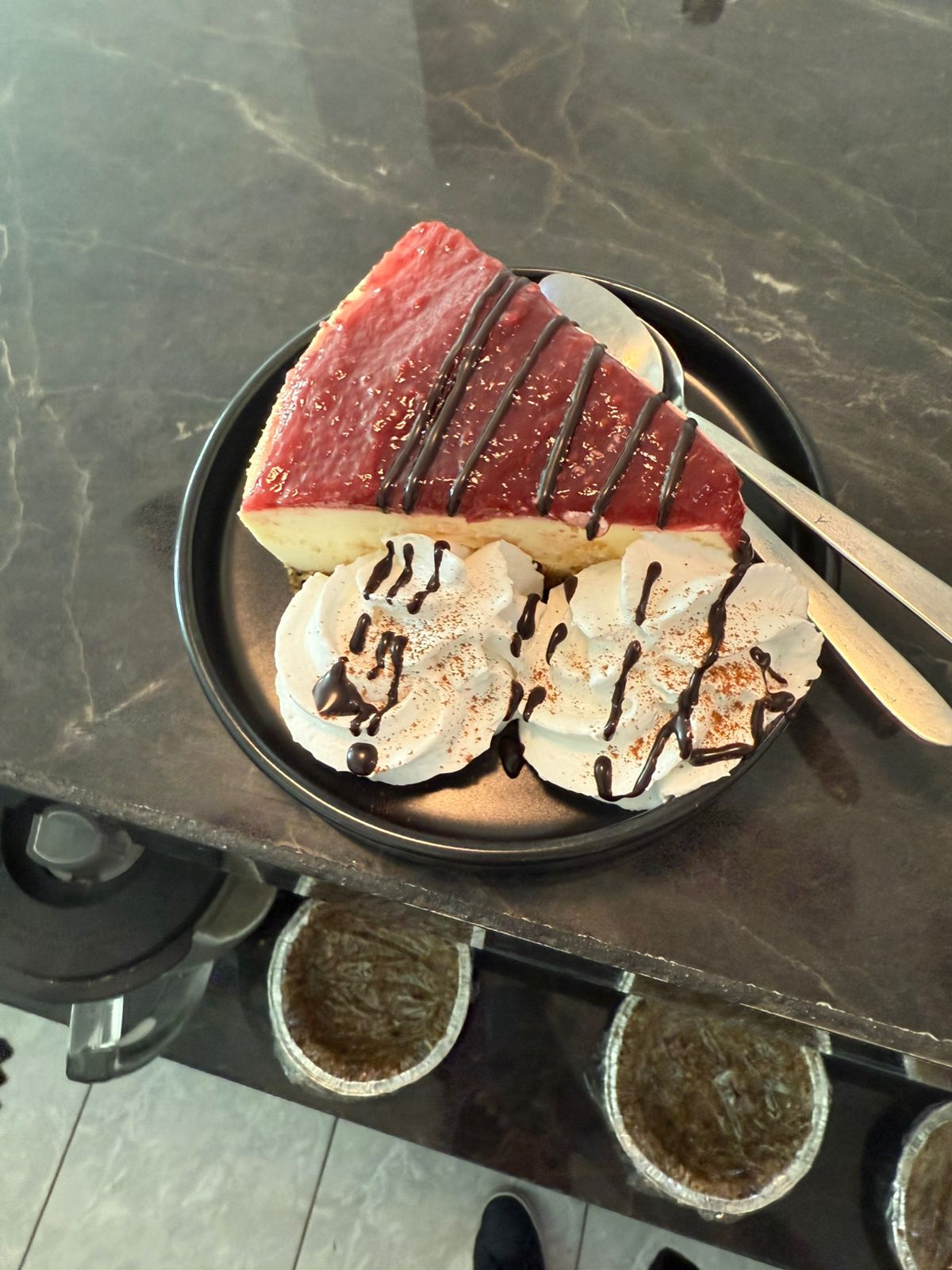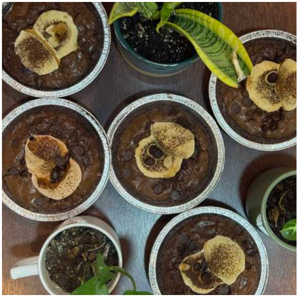 Rico brownie hecho en la casa con un toque de mascabada y cacao, terminando con dos piezas de bombon horneado