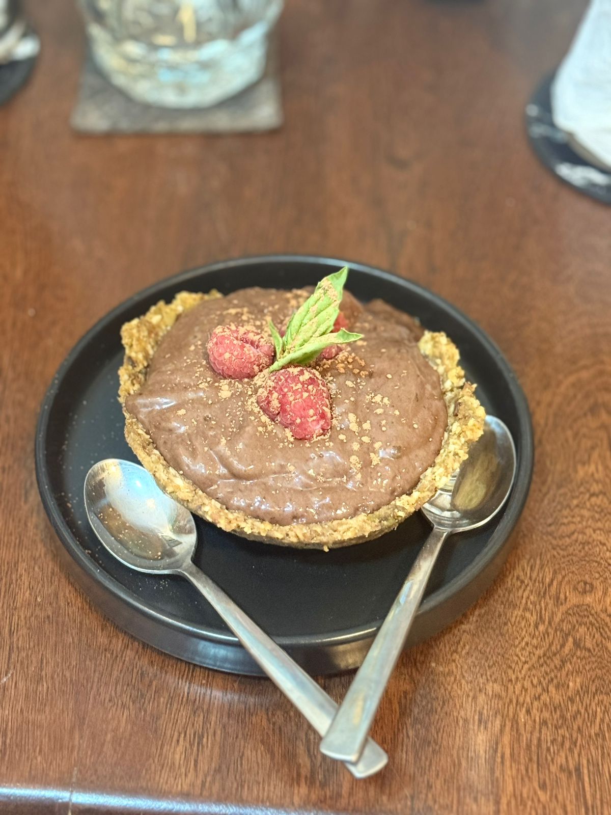 Base de dátiles, hecho con aguacate y cacao, con un top de coco rallado