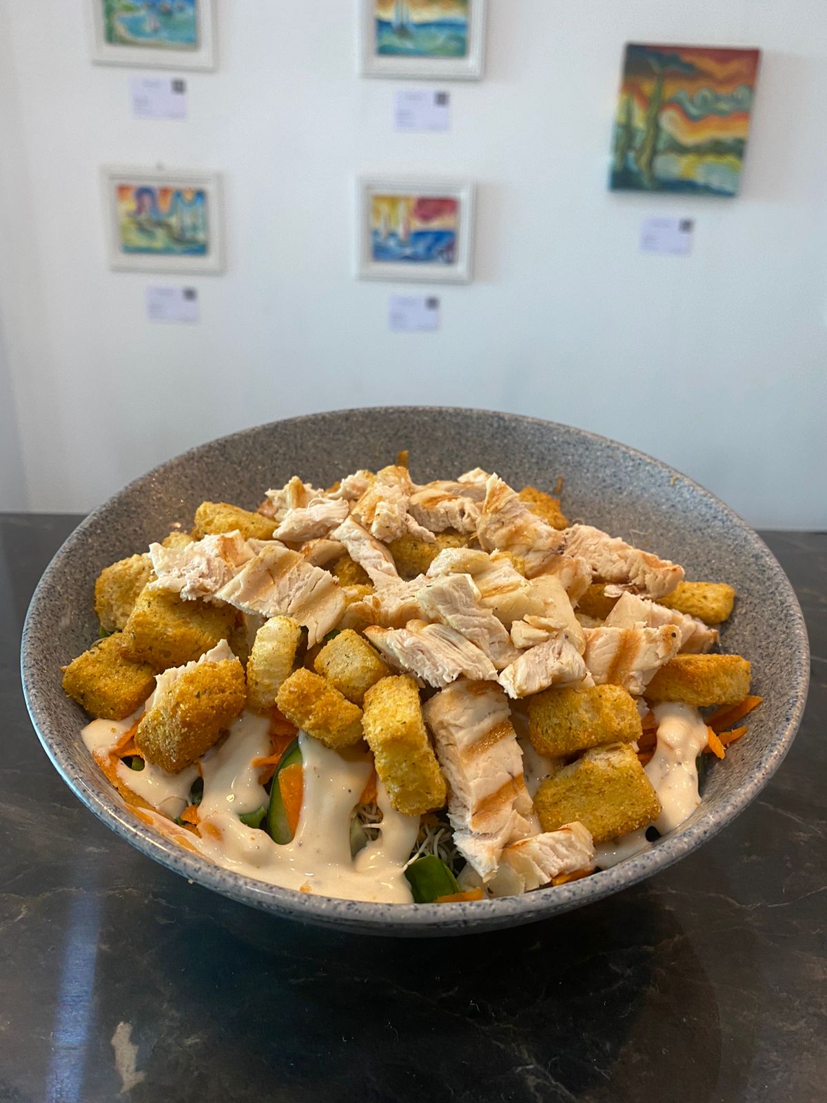 Zanahoria, germinado, lechuga, pollo y aderezo cesar.