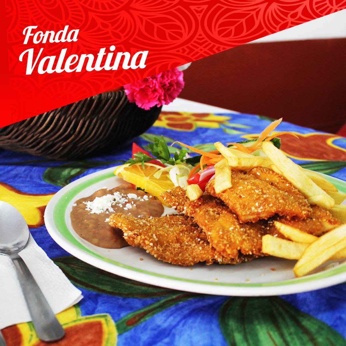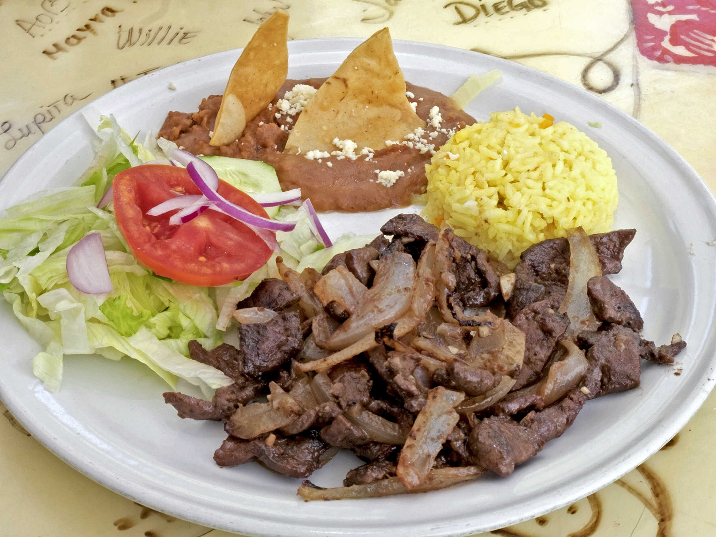 Acompañado de arroz, frijoles, ensalada y papas fritas