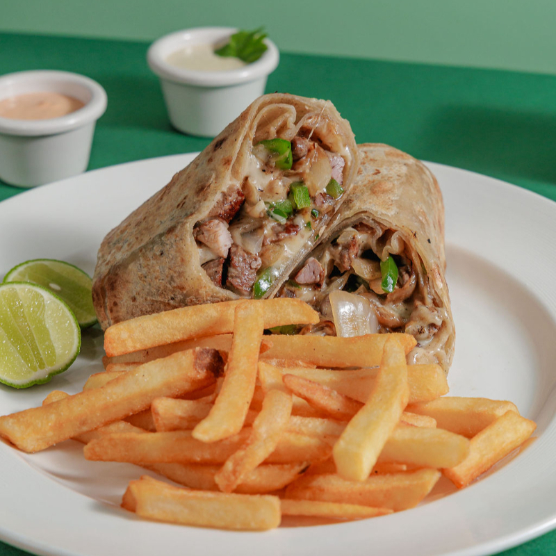 Tortilla de harina grande, rellena de res, guisada con cebolla blanca, chile poblano y gratinado con queso gouda, acompañado de una guarnición a elegir.