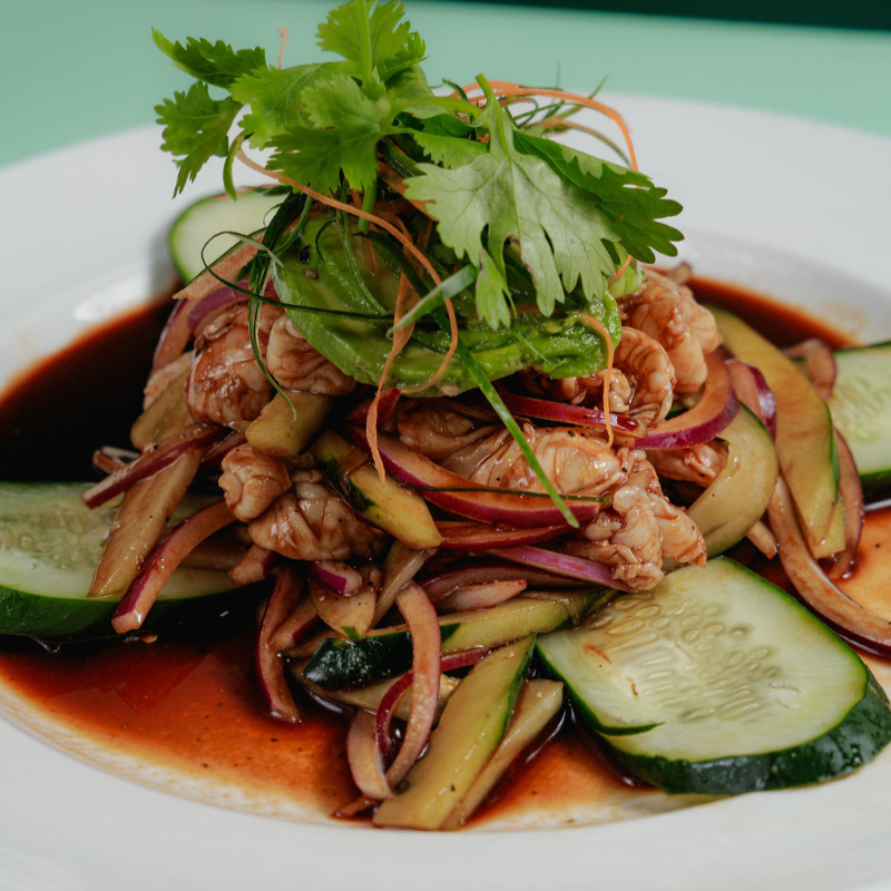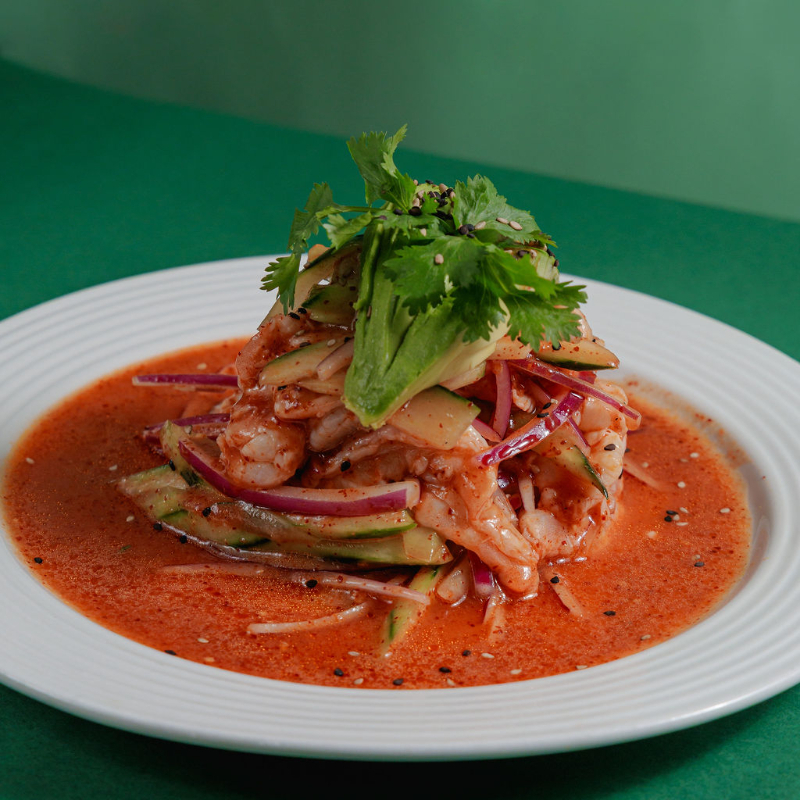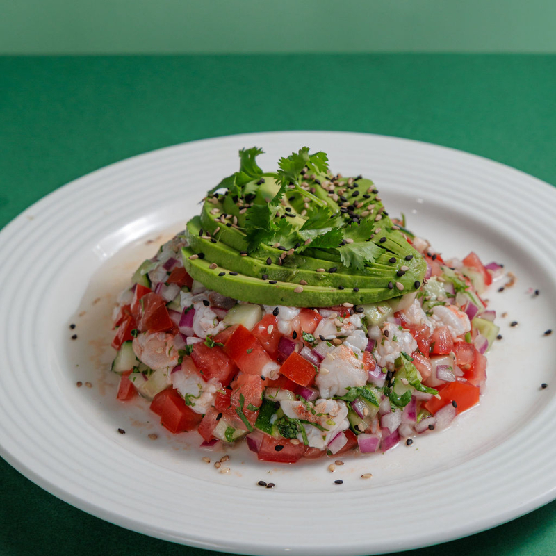 Camarón curtido con limón en salsas negras, mezclado con pepino, cebolla morada y aguacate. Acompañado de tostadas marisqueras y galletas saladitas.