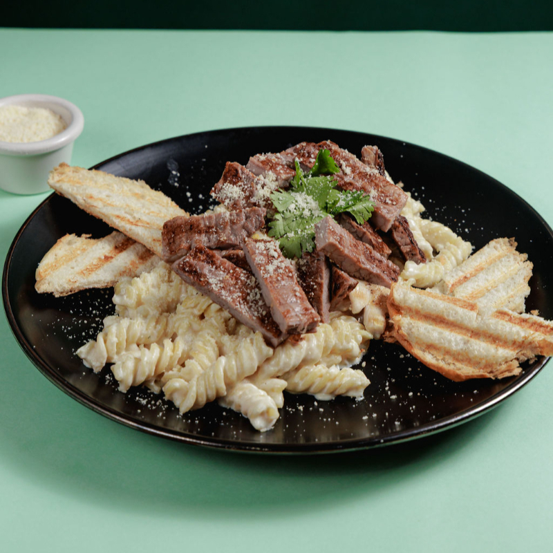 Pasta fetuccini mezclado con nuestra cremosa salsa alfredo, mezclado con el sabor intenso y jugoso de arrachera.