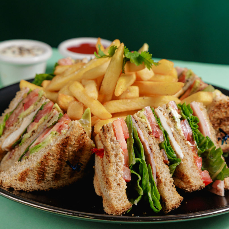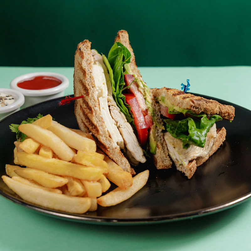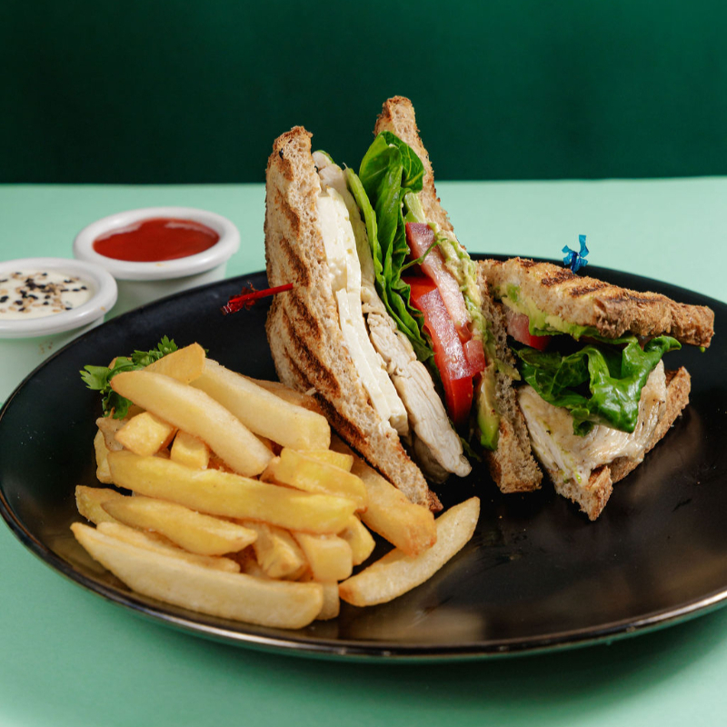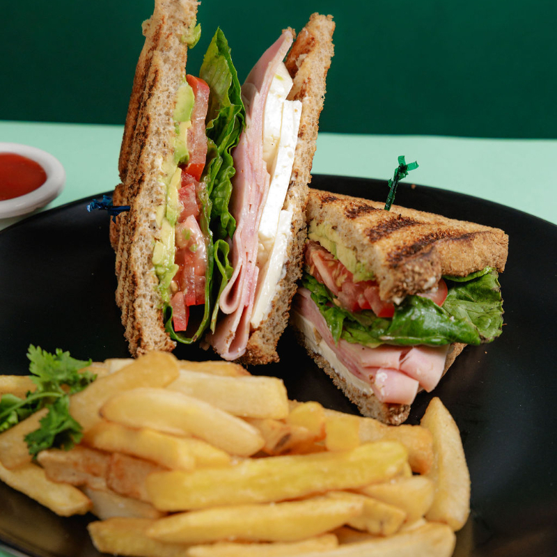 Pan integral, pollo, tocino, jamón, mayonesa, jitomate, lechuga y aguacate. Acompañado 1 guarnición a elegir.