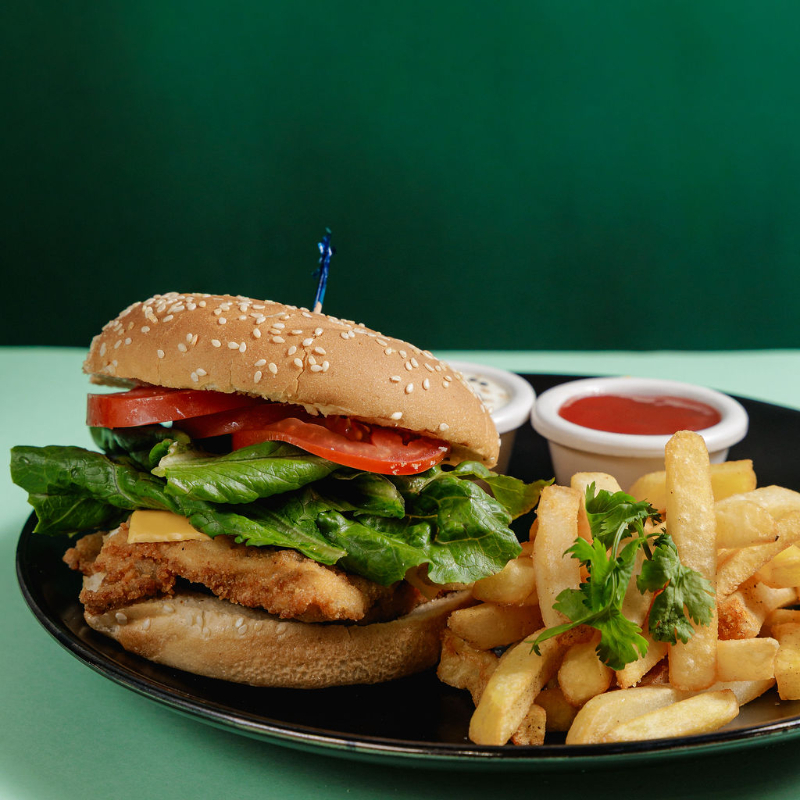 Rico y crujiente pollo empanizado, en pan de ajonjolí, mayonesa, queso amarillo, lechuga, jitomate y cebolla morada. Acompañada de 1 guarnición a elegir.