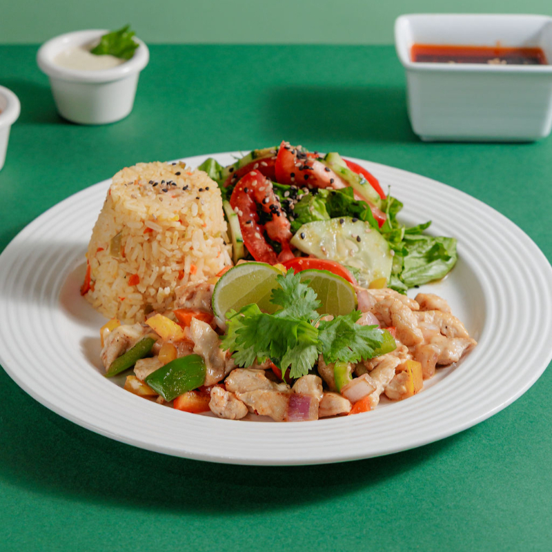 Milanesa de pollo, guisada con cebolla morada, morrón verde, amarillo y rojo, acompañado de 2 guarniciones a elegir.