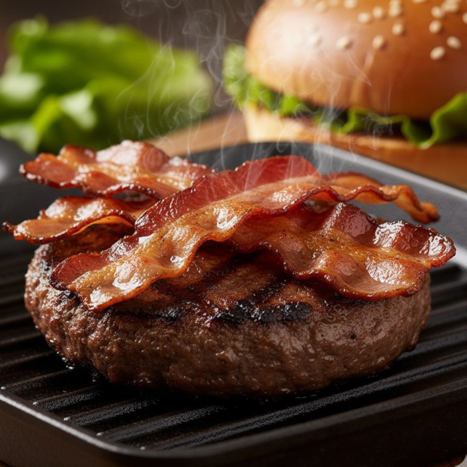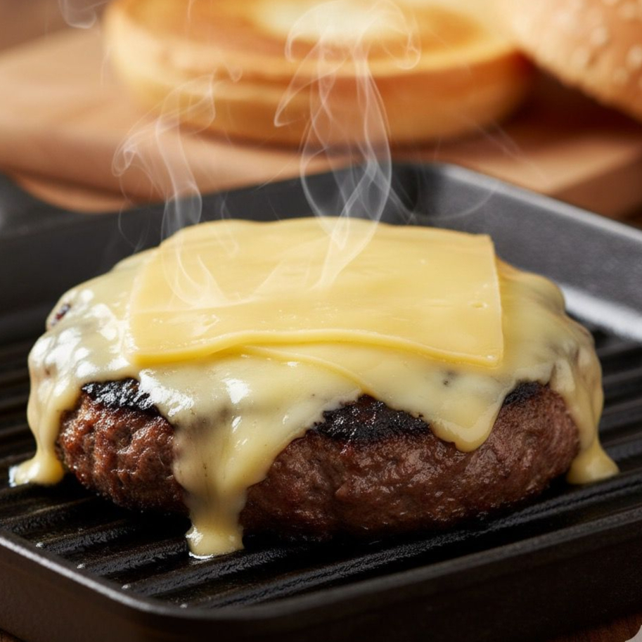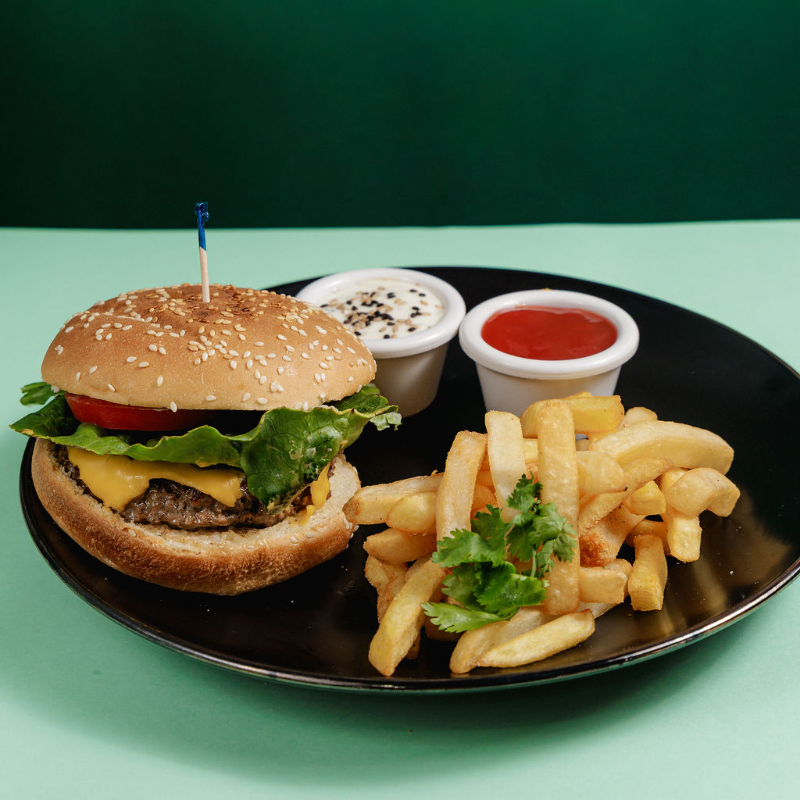 150 gr de carne molida de res con la sazón de casa, en pan de ajonjolí mayonesa, queso amarillo, lechuga, jitomate y cebolla morada. Acompañada de 1 guarnición a elegir.