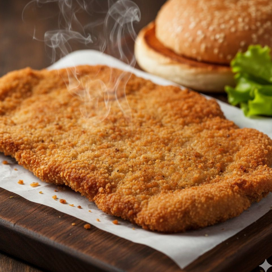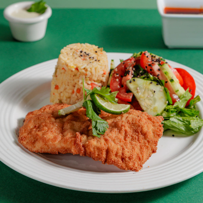 Milanesa de pollo empanizado, crujiente, acompañada de 2 guarniciones a su elección.