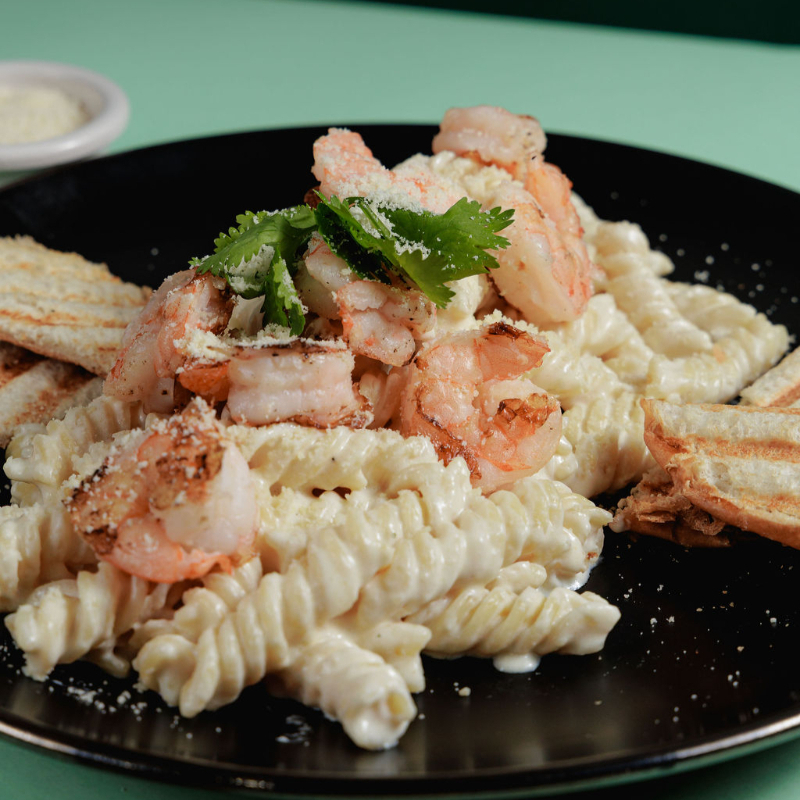 Pasta fetuccini mezclado con nuestra cremosa salsa alfredo, mezclado con el sabor fresco y delicado del camarón.