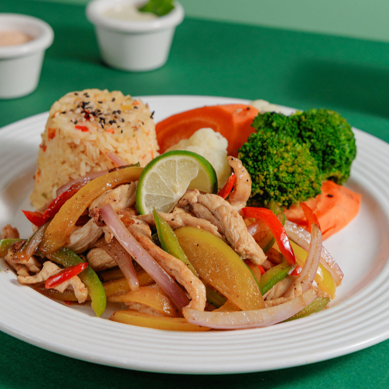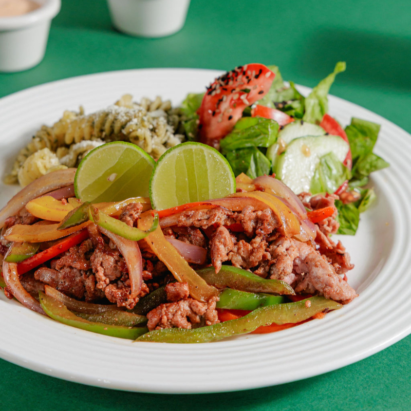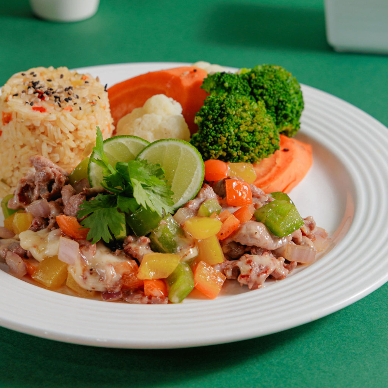 Carne de res, guisada con cebolla morada, morrón verde, amarillo y rojo, acompañado de 2 guarniciones a elegir.