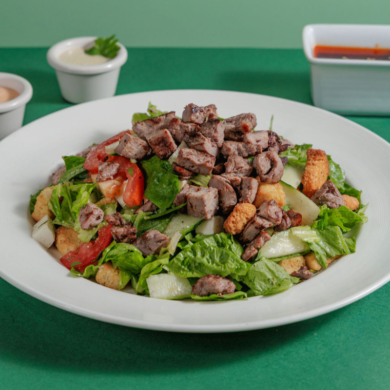 Base de lechuga, arrachera a la plancha, panela, pepino, jitomate, crotones y vinagreta de la casa.