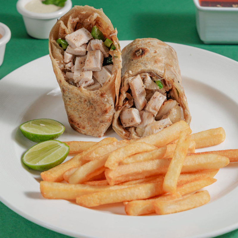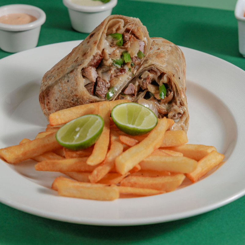 Tortilla de harina grande, rellena de jugosa milanesa de pollo, guisada con cebolla blanca, chile poblano y gratinado con queso gouda, acompañado de una guarnición a elegir. Papas a la francesa o ensalada